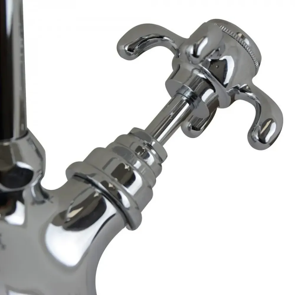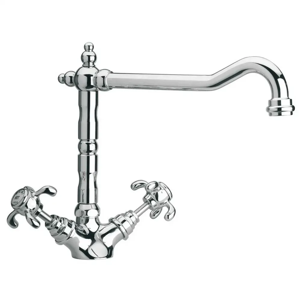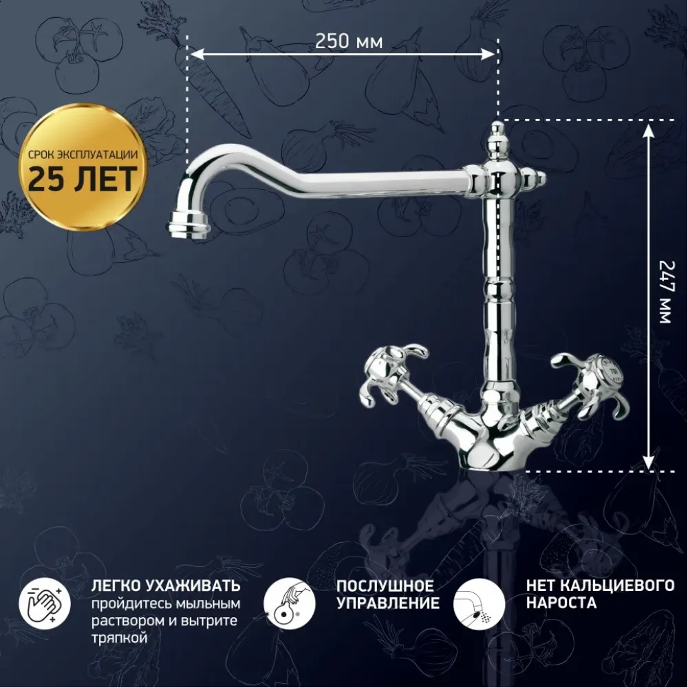 Высокий корпус и поворотный излив делают двухвентильный смеситель незаменимым для кухни, позволяя наполнить кастрюлю или вазу водой, помыть посуду. Изгиб длинного прямого излива делает функциональность небанальной и привлекательной. Смеситель сможет стать украшением дизайна в стиле нео-классицизм, модерн или расставить акценты в стиле фьюжн.