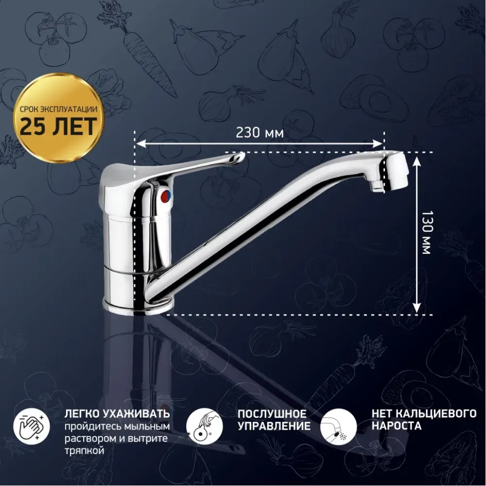 Однорычажный смеситель для кухни PILOT, несмотря на компактные габариты, обладает всеми необходимыми функциями, благодаря чему стал популярным в своей ценовой категории. Поворотный излив позволяет менять направление струи, а большая ручка смесителя, расположенная сверху, позволяет включить воду запястьем или локтем, если руки испачканы.