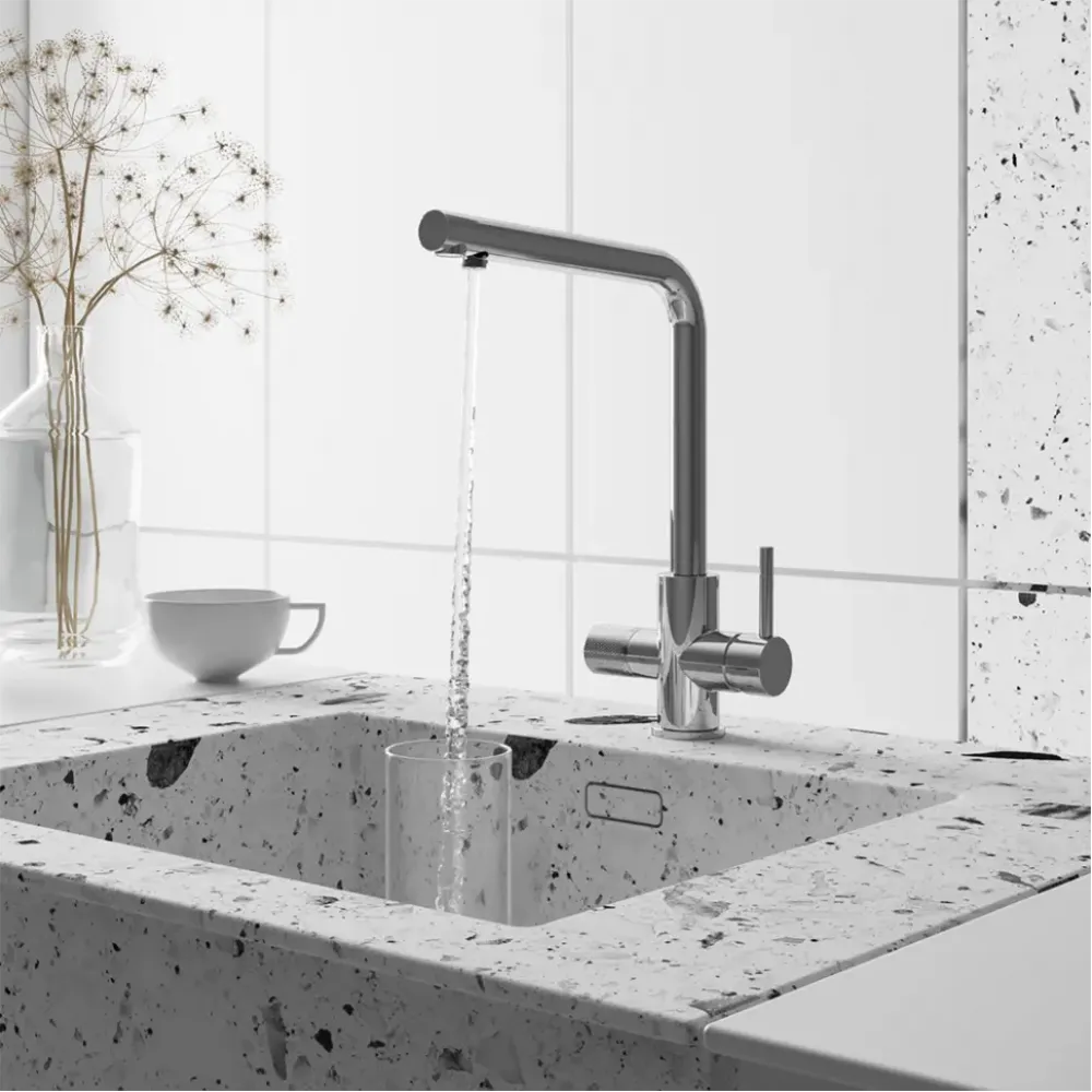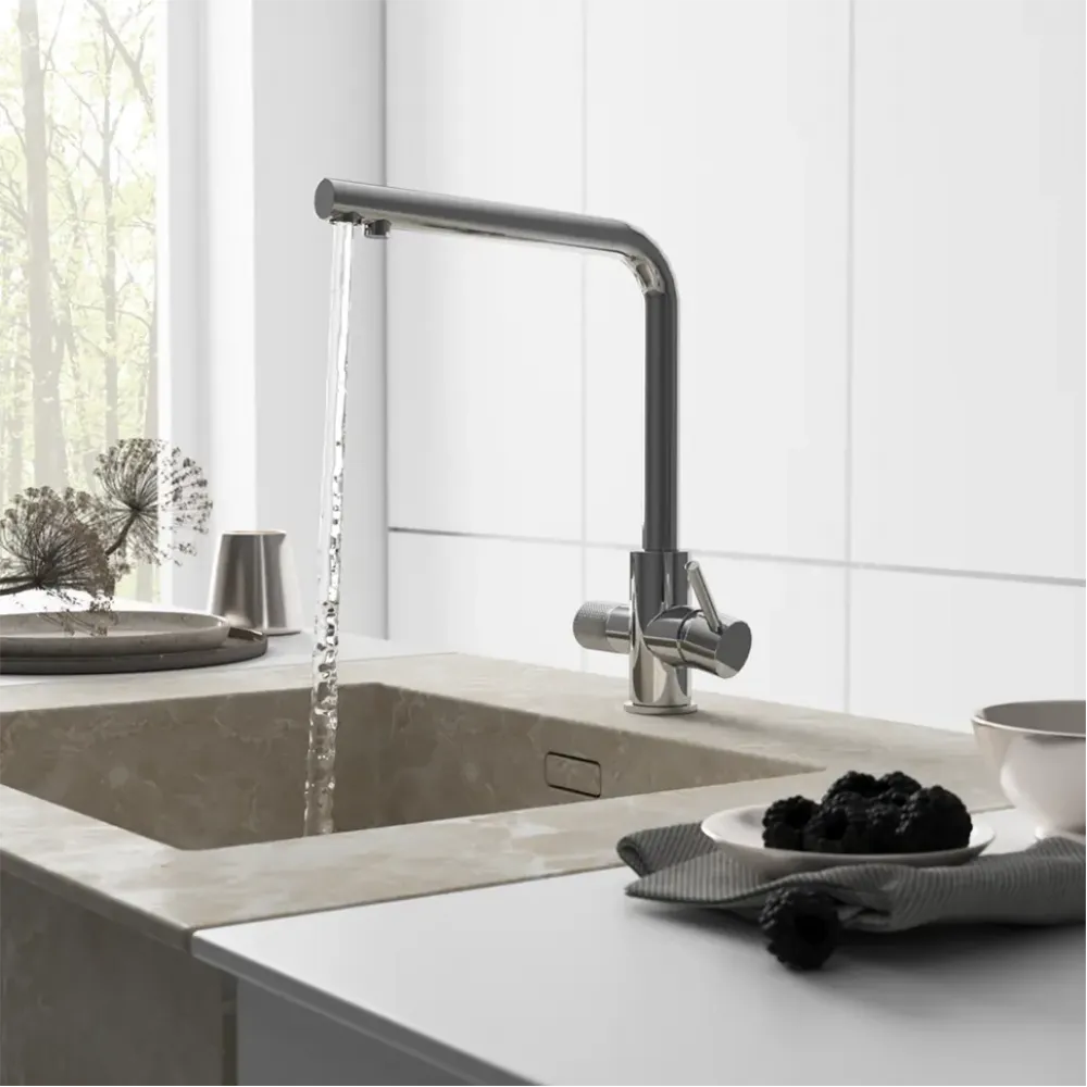 - Помимо стандартного рычага для управления температурой воды и открытия / закрытия, имеется рычаг для подачи фильтрованной воды.