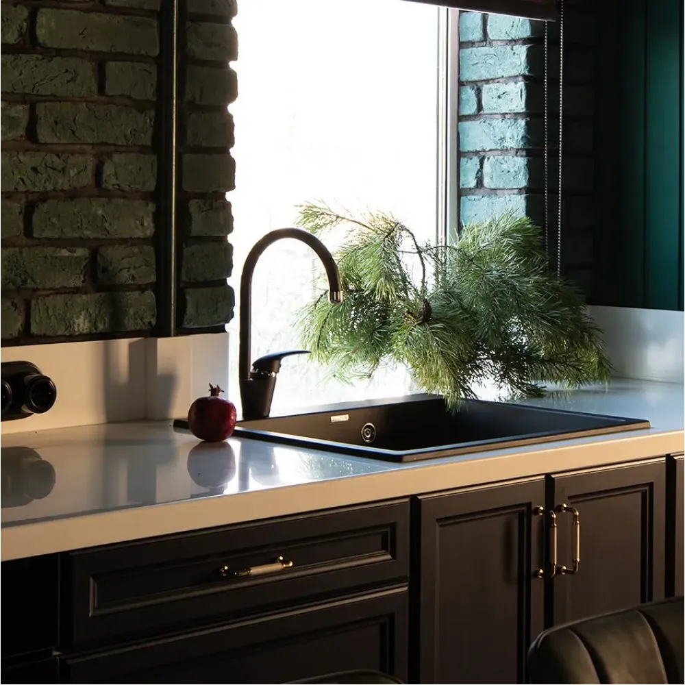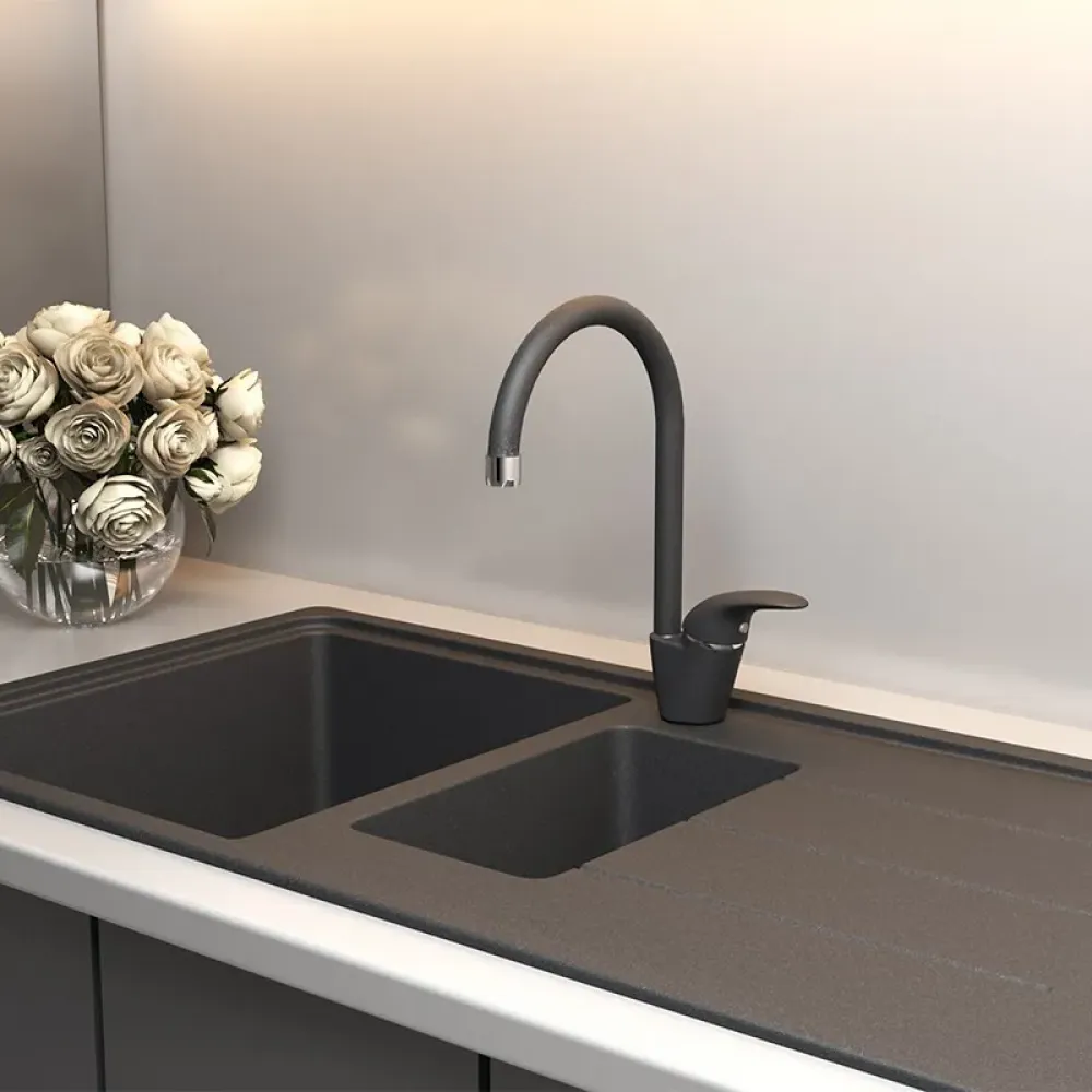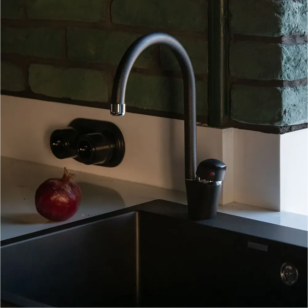 Однорычажный смеситель SICILY для кухни выполнен в цвете “черный гранит” с вкраплениями хромовых элементов, добавляя оригинальность в интерьер. Благодаря высокому корпусу и поворотному изливу этот смеситель открывает больше функциональных возможностей для использования, позволяя менять направление потока воды, использовать глубокую посуду. Удобный рычаг расположен сбоку, что позволяет открыть воду локтем, если руки испачканы. Смеситель SICILY отлично подойдет для кухонь различных размеров и стилей, например, классика, модерн или минимализм.