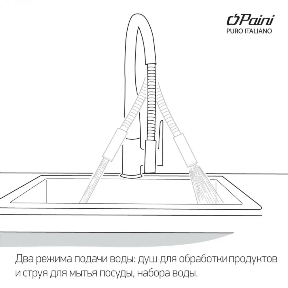 Однорычажный смеситель для кухни в универсальном цвете хром, приправленный дизайнерской "перчинкой" - деликатными акцентами в черном цвете на ручке и изливе. Кроме внешней оригинальности смеситель фабрики PAINI настоящий труженик на кухне: благодаря выдвижному изливу можно легко набрать воду в глубокие емкости вне мойки, сполоснуть посуду разной формы, а несколько режимов подачи воды сделают использование еще комфортнее. Большая ручка смесителя позволяет включить воду запястьем или локтем, если руки испачканы.