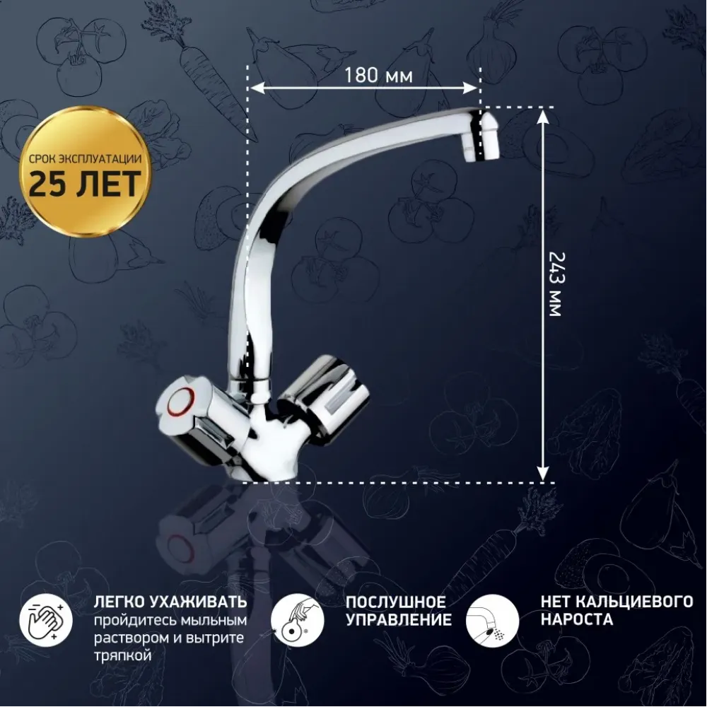Высокий поворотный излив позволяет менять направление потока воды, использовать глубокую посуду.