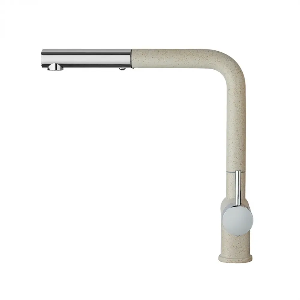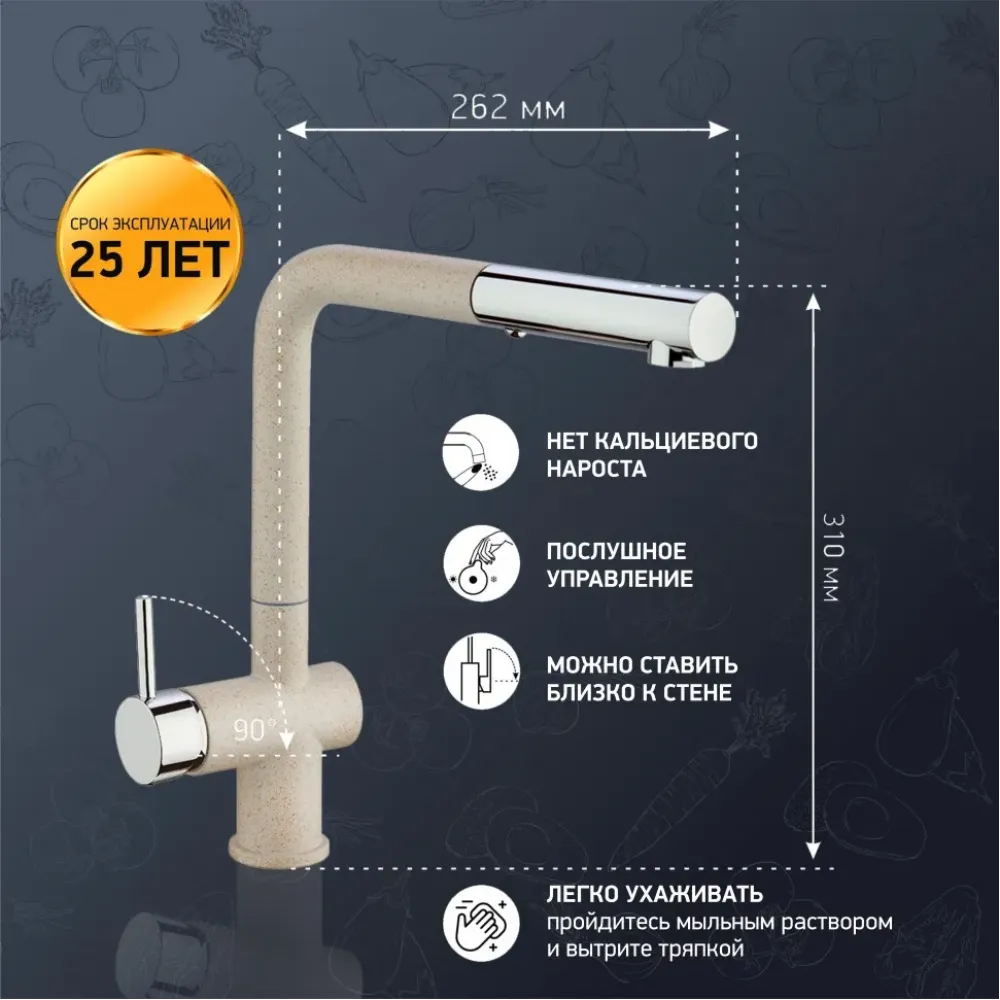 Три варианта бежевого цвета: сахара, бежевый с вкраплениями (гранит) и нежный трюфель, а также белый с вкраплениями (гранит) и комбинация черного и хромого цветов в корпусе смесителя. Теперь точно получится попасть в цвет столешницы и/или цвет мойки либо создать контрастные сочетания. Все варианты покрытия, включая покрытие под камень, выполнены по специальной технологии, сохраняющей цвет и фактуру надолго и облегчающей уход за смесителем.