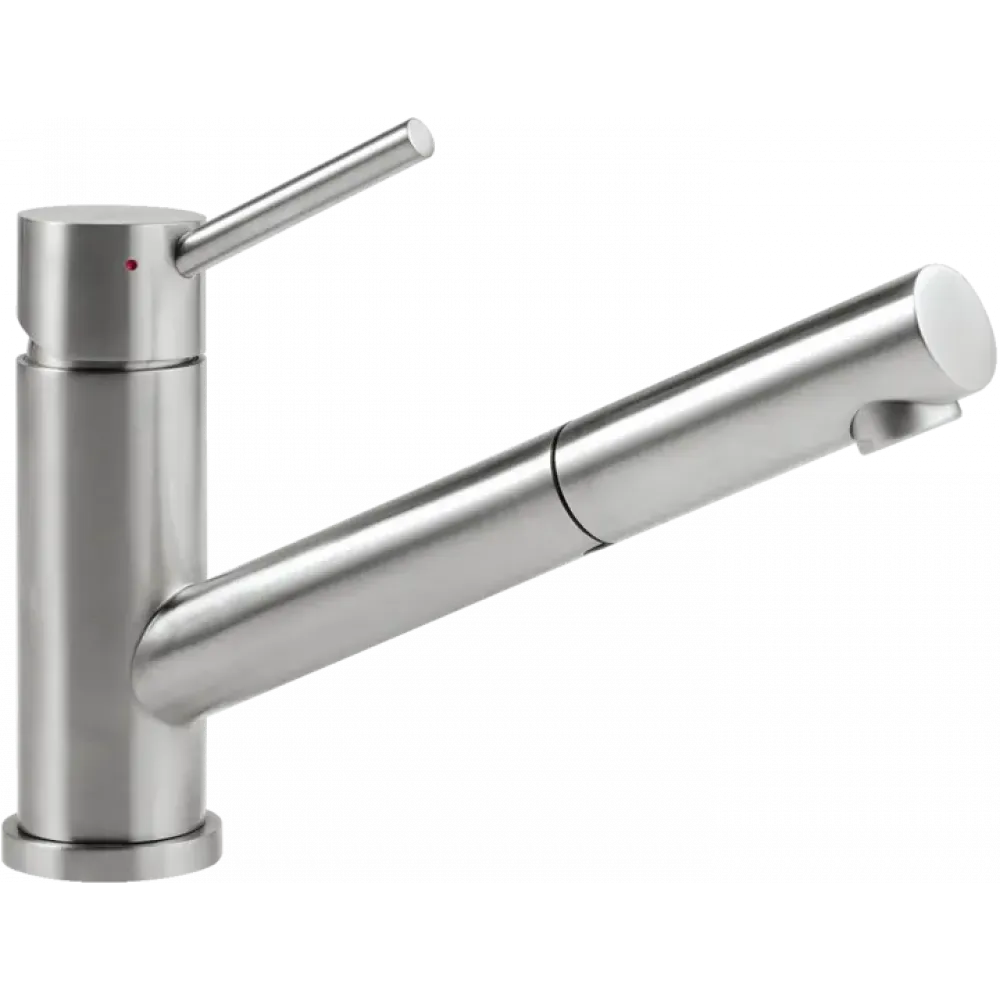 Сталь нержавеющая, |Материал картриджа: пластик, керамические прокладки||Диапазон поворота: 120°||Угол ручки: 25°||Душевой шланг: встроенный, вытяжной, длина 1800 мм||Пропускная способность для комфортной струи: 8,0 л/мин||Подводка гибкая, длина 600 мм||Возврат душевой лейки посредством пружины возврата