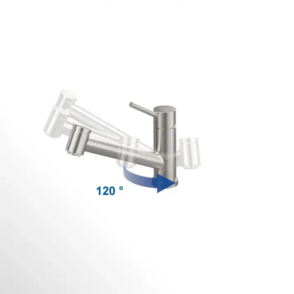 Сталь нержавеющая, |Материал картриджа: пластик, керамические прокладки||Диапазон поворота: 120°||Угол ручки: 25°||Душевой шланг: встроенный, вытяжной, длина 1800 мм||Пропускная способность для комфортной струи: 7,8 л/мин||Пропускная способность для рассеянной струи: 5,0 л/мин||Подводка гибкая, длина 600 мм||Ручной душ с двумя функциями струи||Возврат душевой лейки посредством пружины возврата