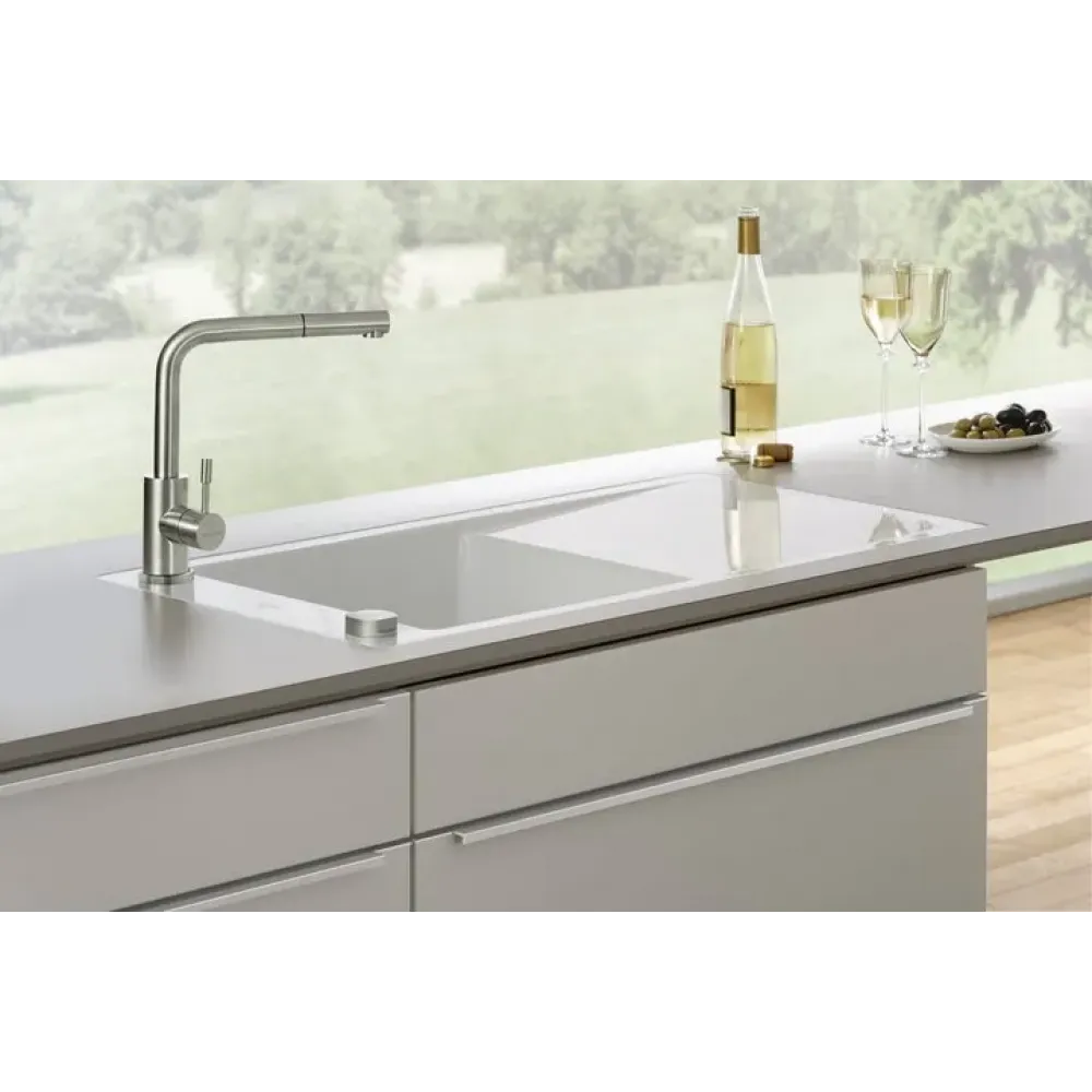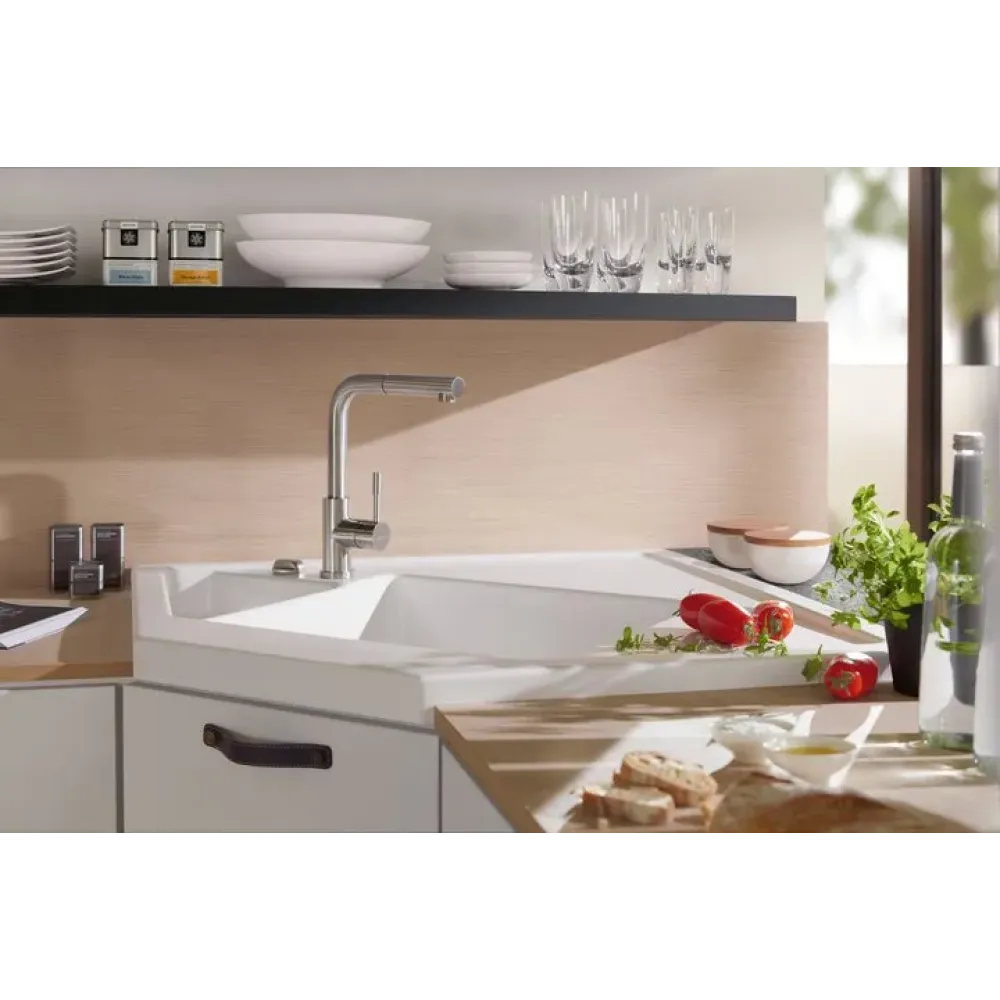Steel Shower впечатляет четкими линиями и современным дизайном. Массивная высококачественная сталь эффектно подчеркивает лаконичную форму смесителя. Благодаря вытяжному душу смеситель отлично подходит для мытья больших кастрюль.