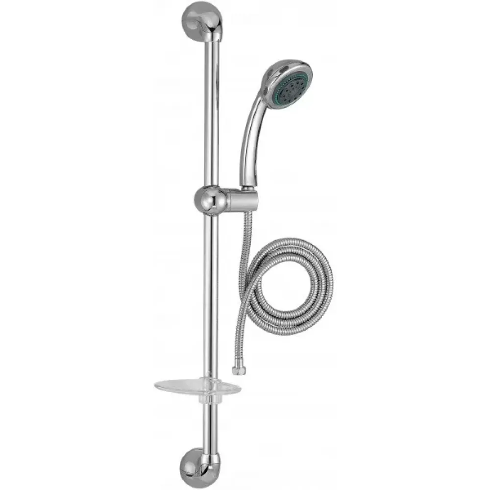Душевой комплект со штангой 0,75 м, мыльницей, шлангом в двойной металлической оплетке 1,75 м и трехрежимным ручным душем с антиизвестковым покрытием.