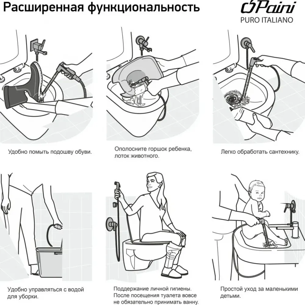 - С помощью гигиенического душа очень легко ополоснуть подошву обуви, горшок ребенка, лоток для животного.