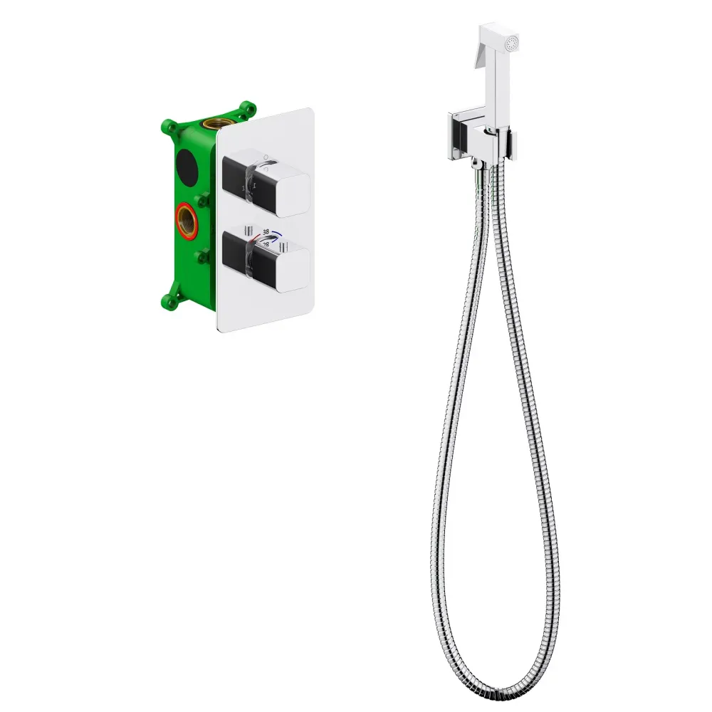 | МатериалЛатунь класса А | Тип смесителяС термостатом, Скрытого монтажа с гигиеническим душем | УправлениеДвухвентильное |