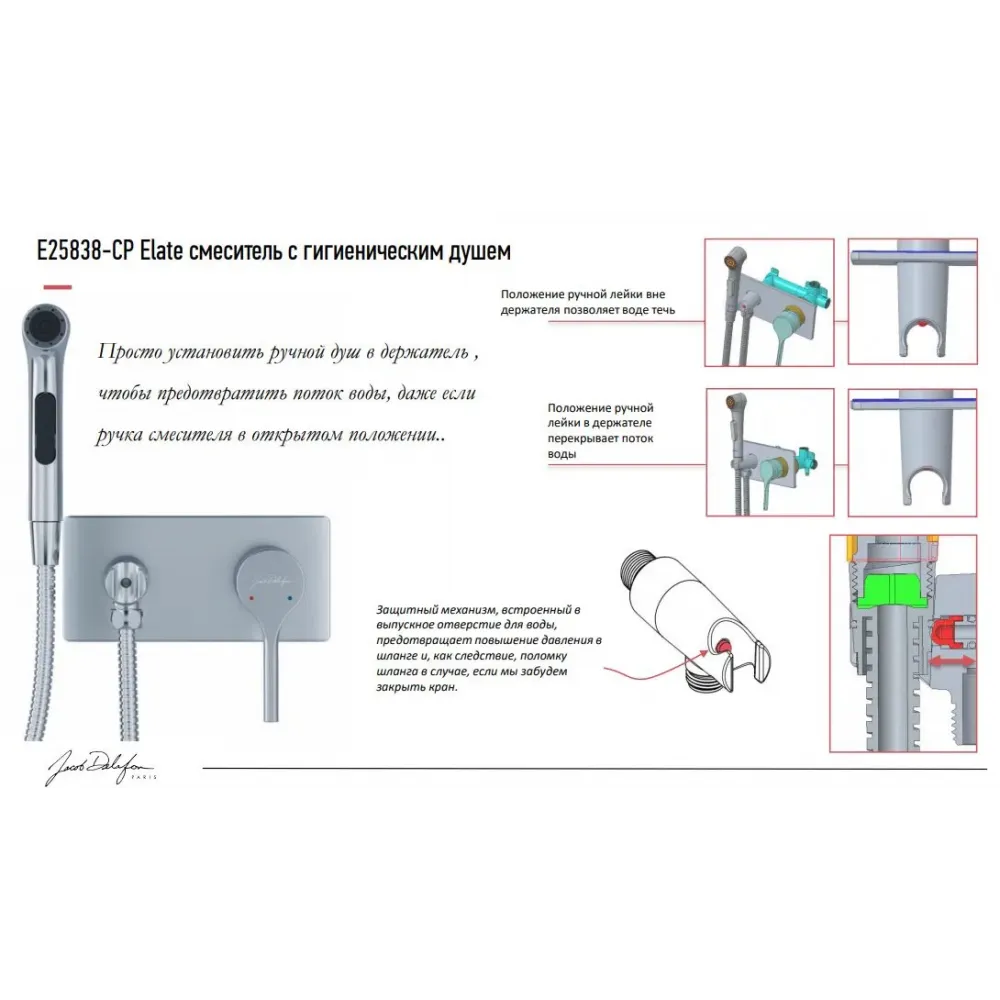 Технические характеристики Встраиваемый гигиенический душ Elate на одной планке, двухэлементный, пластик, с защитой от потопа E25838-CP Jacob Delafon