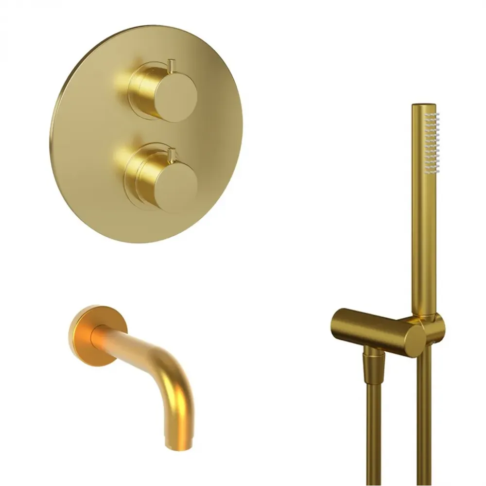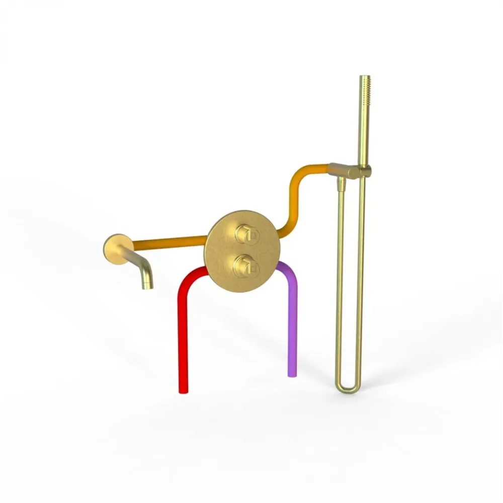 Комплект на 2 потребителя с термостатом Cox PAINI, для ванны с ручным душем, брашированное золото PVD