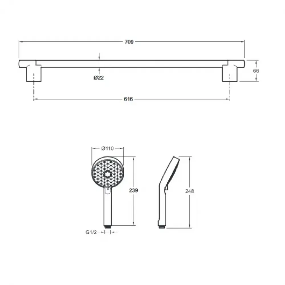 Душевой гарнитур: штанга 70,9 см, лейка 110 мм на 5 режимов, шланг с защитой от перекручивания