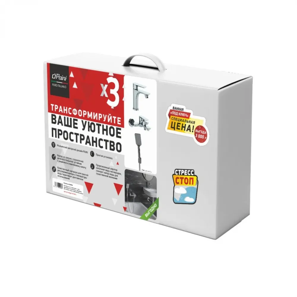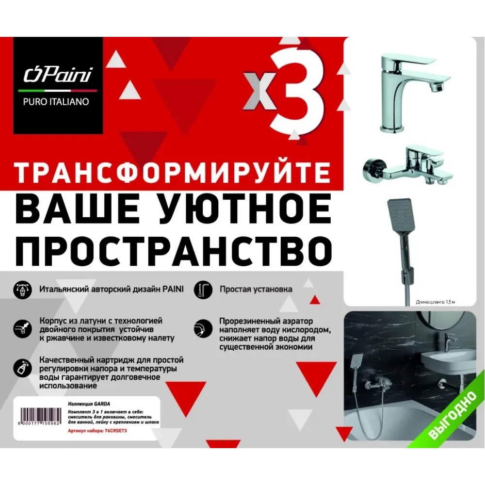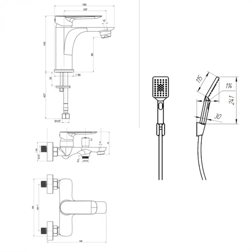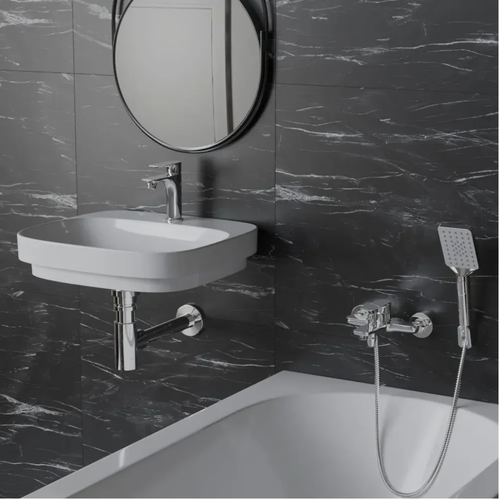 Мы подобрали оптимальный комплект в универсальном дизайне - смеситель для ванной, смеситель для раковины и лейка для душа с крепежом.