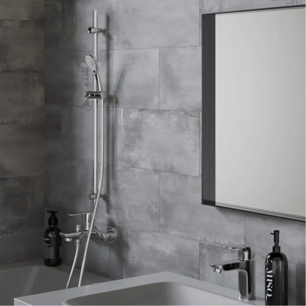 Подобрали для вас функциональный комплект в универсальном дизайне - смеситель для ванной, смеситель для раковины и душевая стойка с лейкой.
