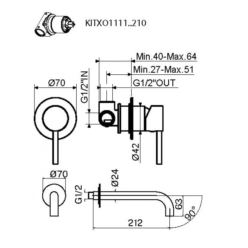 KITXO1135OR210 Комплект встраиваемого смесителя для раковины, излив 210мм, накладка диаметр 70мм, внутренняя часть INT1135 в комплекте, золото IXO, Plumberia Selection