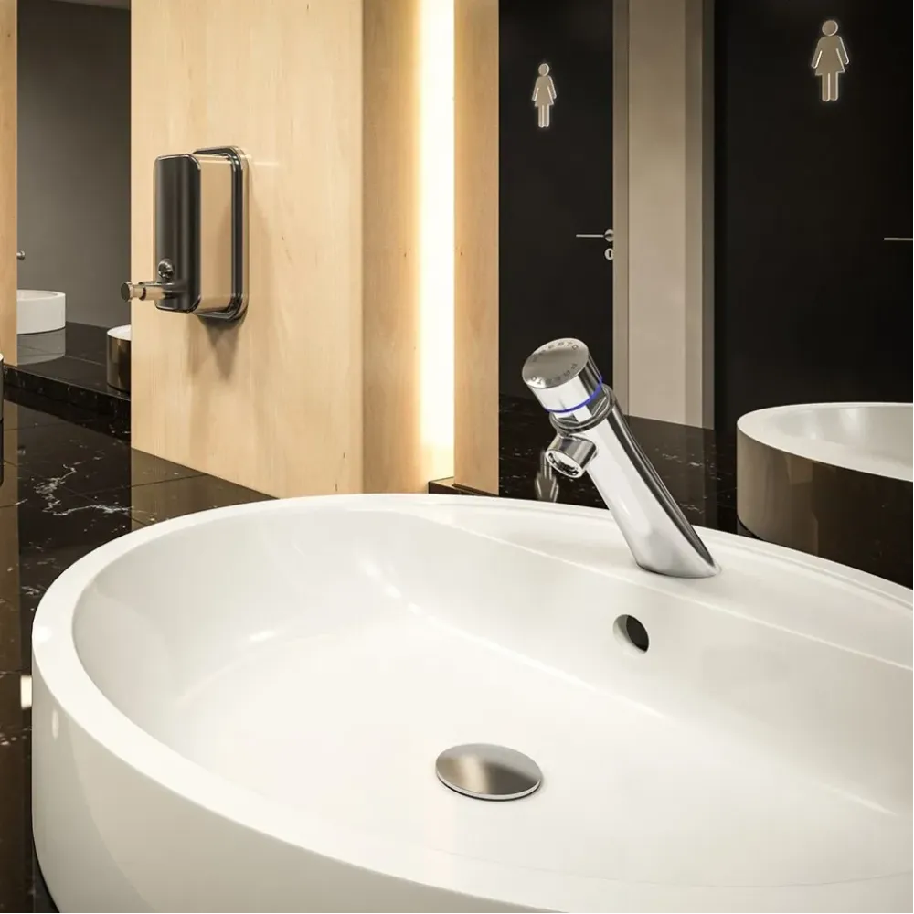 Надежность : запатентованный механизм автоматической очистки, самозакрывающаяся система. Антивандальные решения : не вращающаяся кнопка, настройки расхода воды не доступны для пользователей, антиблокировочная система, индикаторы цвета не снимаются и не изнашиваются. Простое обслуживание: универсальные сменяемые кнопки и картриджи. Современный дизайн для общественных мест.