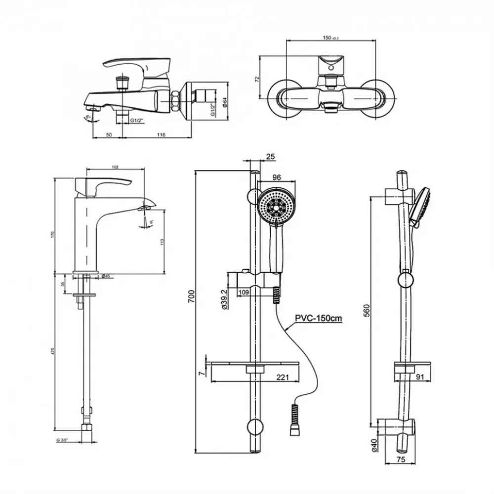 В комплект входит смеситель для раковины (за счет высоты чуть выше средней может отлично размещаться на раковины различных размеров), смеситель для ванны и регулируемый по высоте стальной душевой гарнитур с 5-ти режимной лейкой и полочкой.