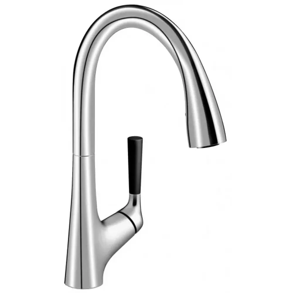 Высокий смеситель для кухни Jacob Delafon Malleco E562-CP однорычажный, с аэратором, с двухрежимным выдвижным изливом, с тремя накладками на ручку разных цветов, монтируемый в одно отверстие.
