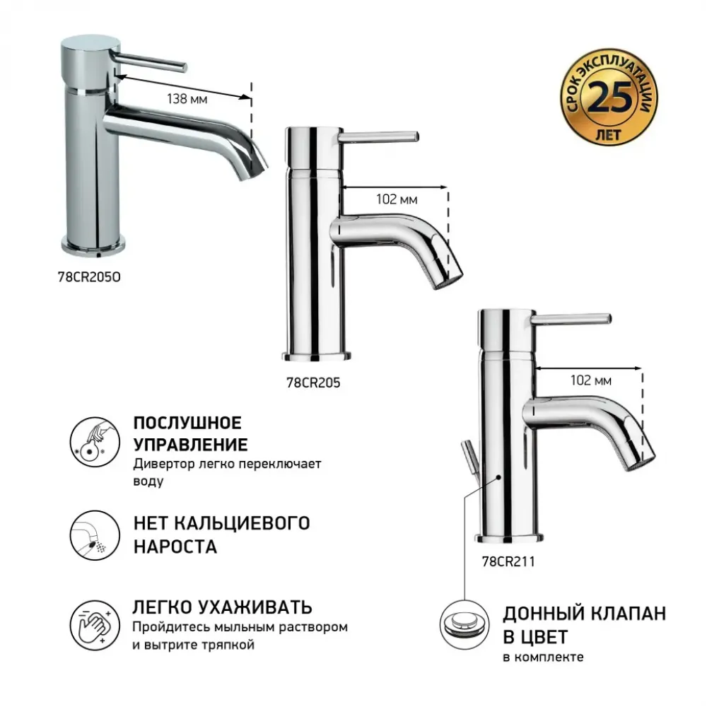 Латунный корпус смесителя для раковины, устойчивый к механическим и химическим повреждениям. Технология двойного покрытия (никелирование и хромирование) для цвета хром CR.