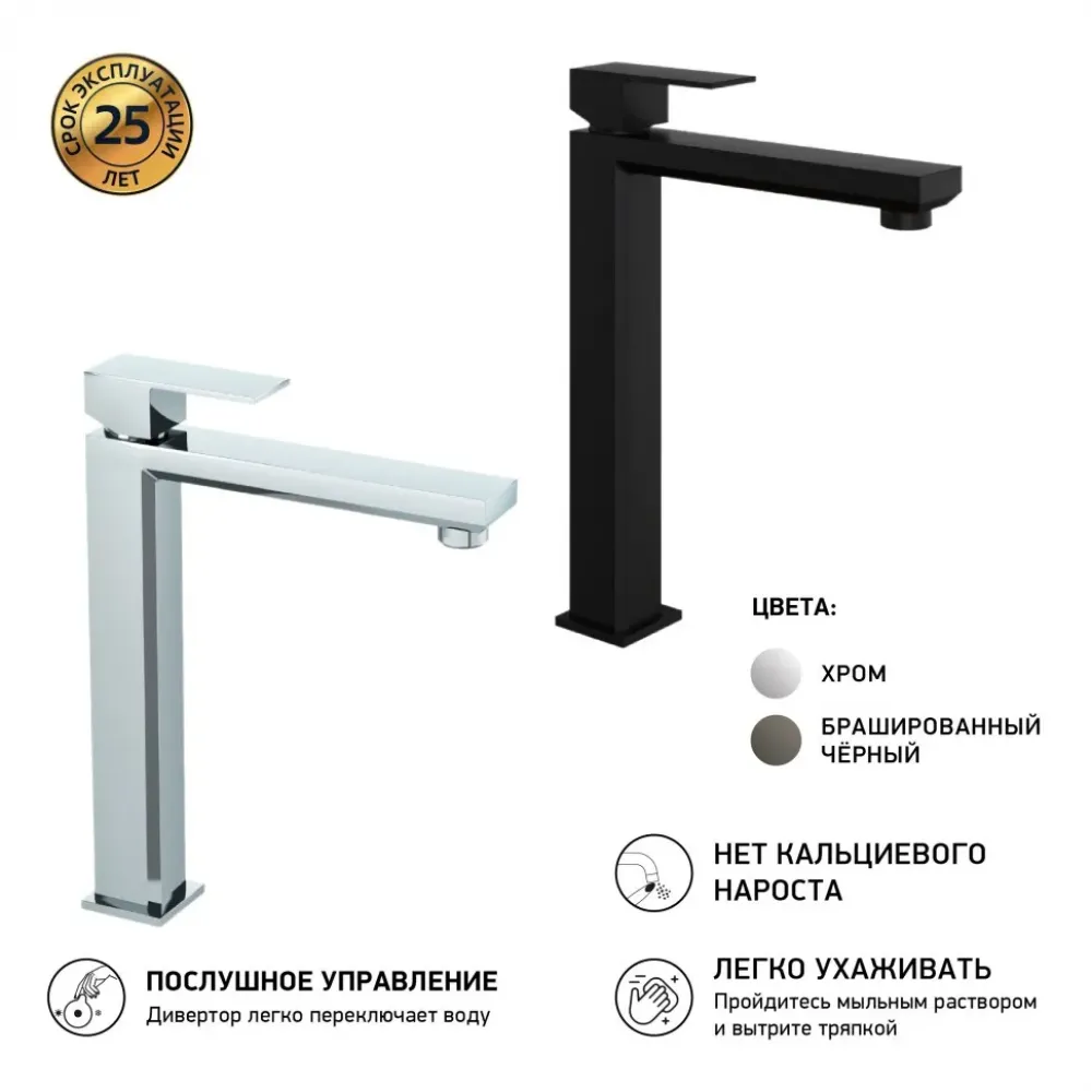 Высокий однорычажный смеситель для раковины своей прямоугольной формой со скошенными углами напоминает архитектурный шедевр. Единство форм всех элементов и тщательно выверенные пропорции позволяют использовать смеситель с максимальным комфортом. Увеличенная высота корпуса смесителя дает дополнительные преимущества при использовании. Геометрия смесителей GRAZIA органично дополнит интерьер в стиле фьюжн, классика, хай-тек, а также прекрасно подойдет для ванной в португальском стиле оформления.