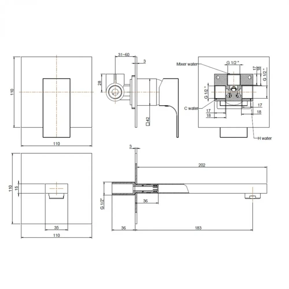 | Тип изделиясмеситель встраиваемый для раковины | Формаквадратная | Цветхром (CR) |
