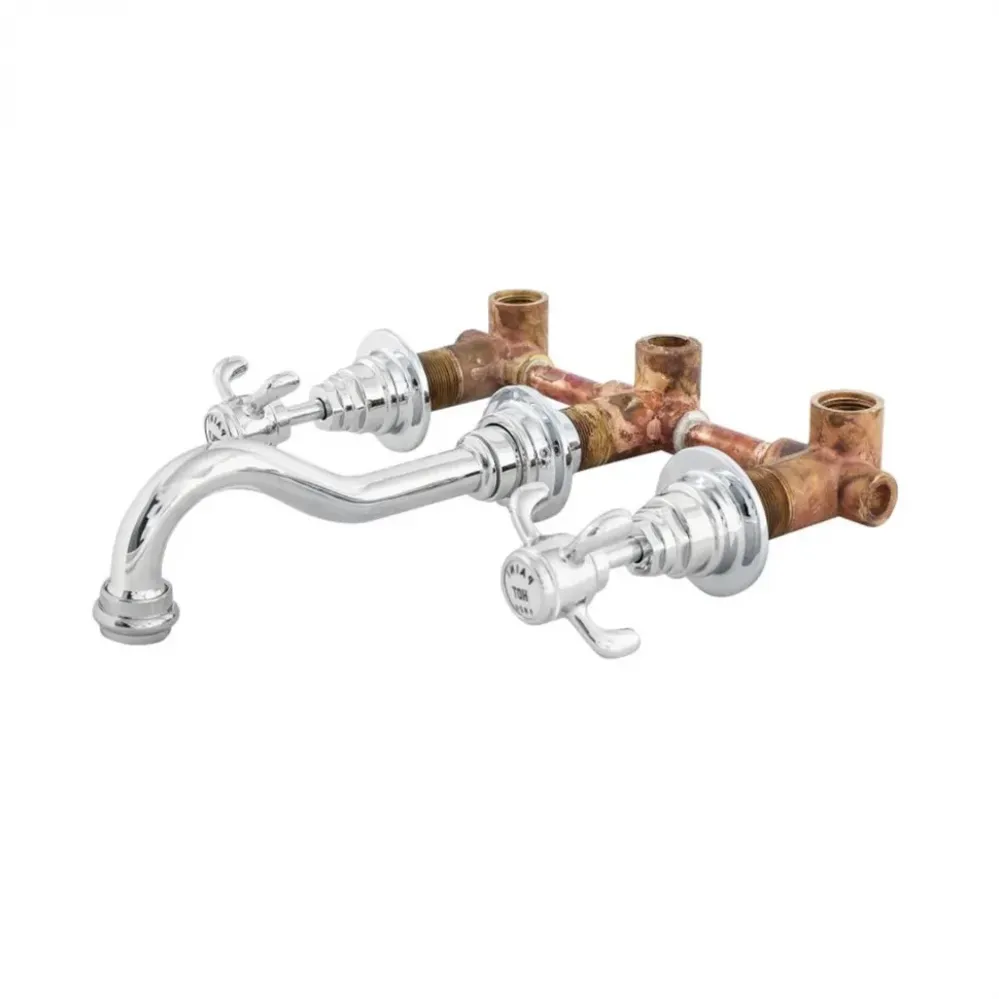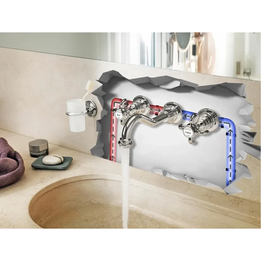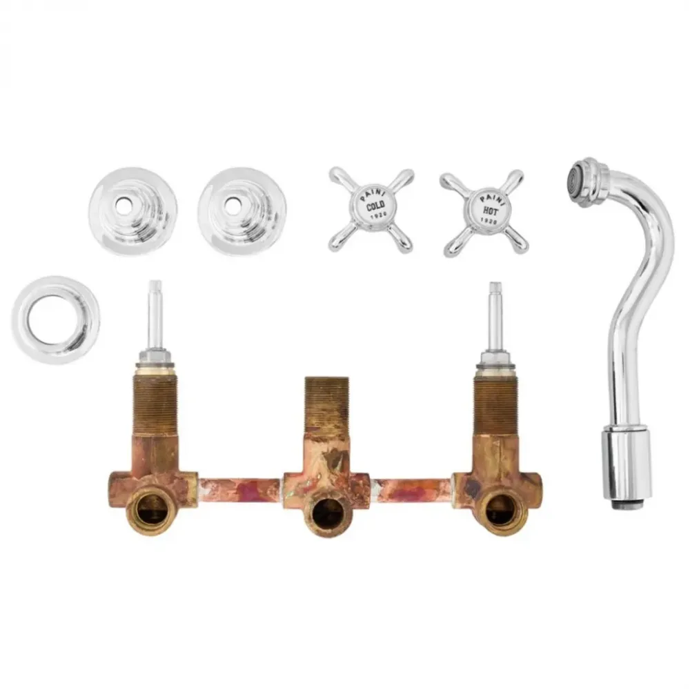 Использование встраиваемого смесителя позволяет спрятать за обшивку все неприглядные коммуникации, установить раковину практически любого размера и формы. Регулировка напора и температуры воды производится с помощью двух вентилей, формирует четко направленную струю, а также дает возможность быстро получить исключительно холодную или только горячую воду. Длина излива — 19 см, высота — 4 см.