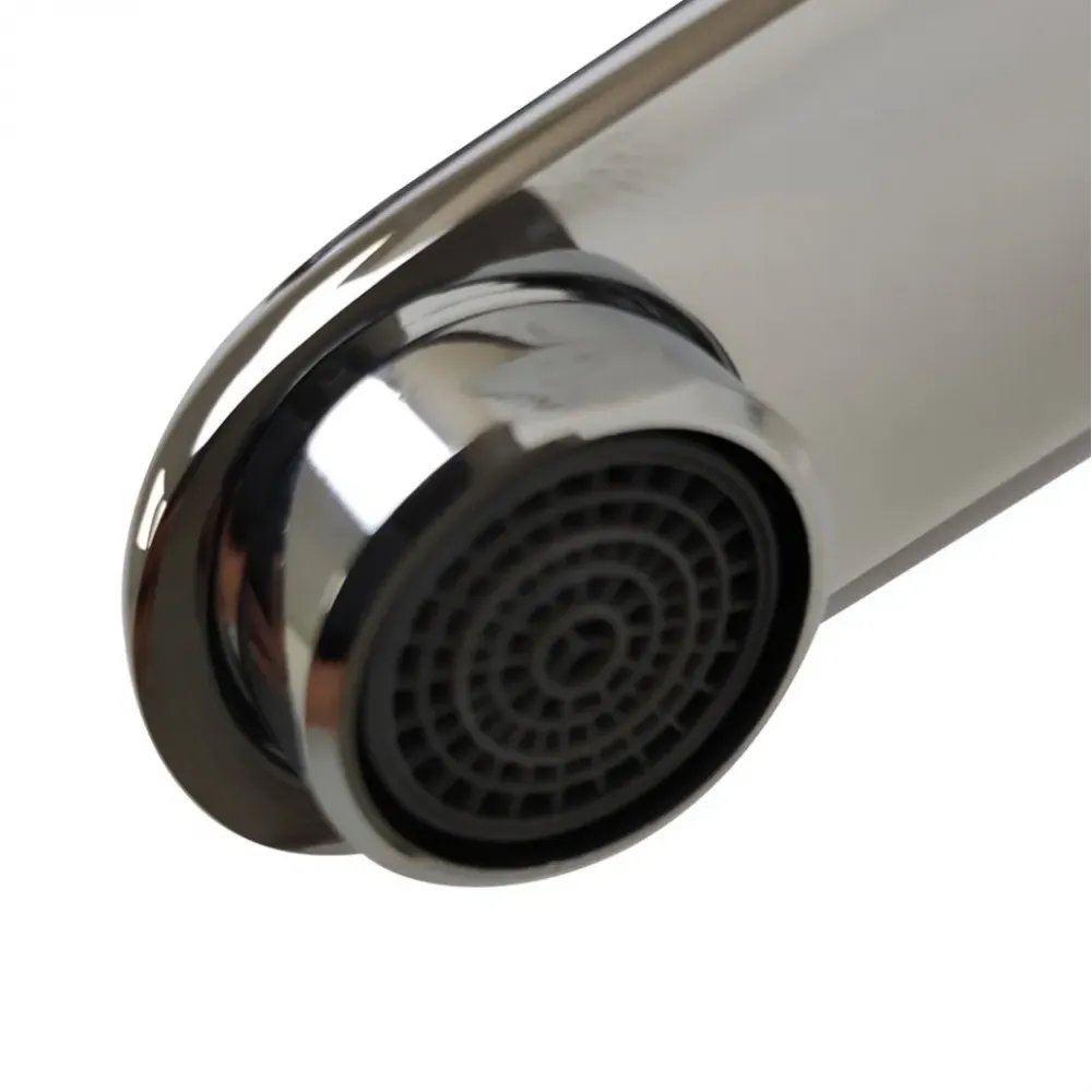 - Аэратор Neoperl под наклоном (струя отводится дальше от края раковины) наполняет воду кислородом, снижает напор воды, вследствие чего становится возможной существенная экономия воды. Сеточка легко очищается пальцем.
