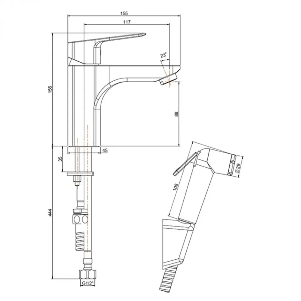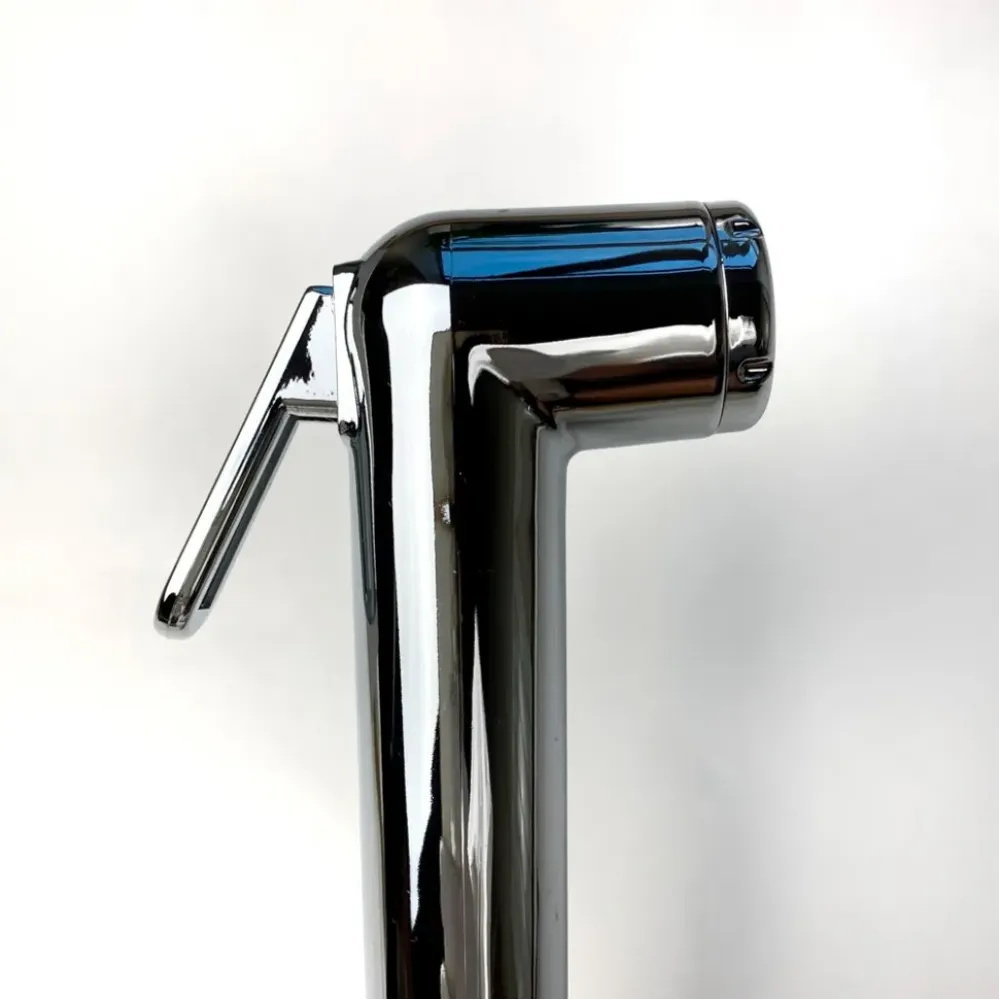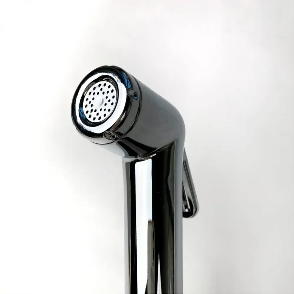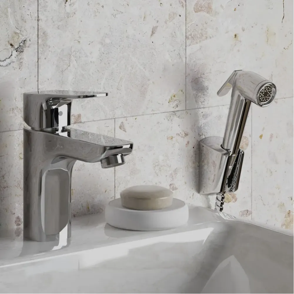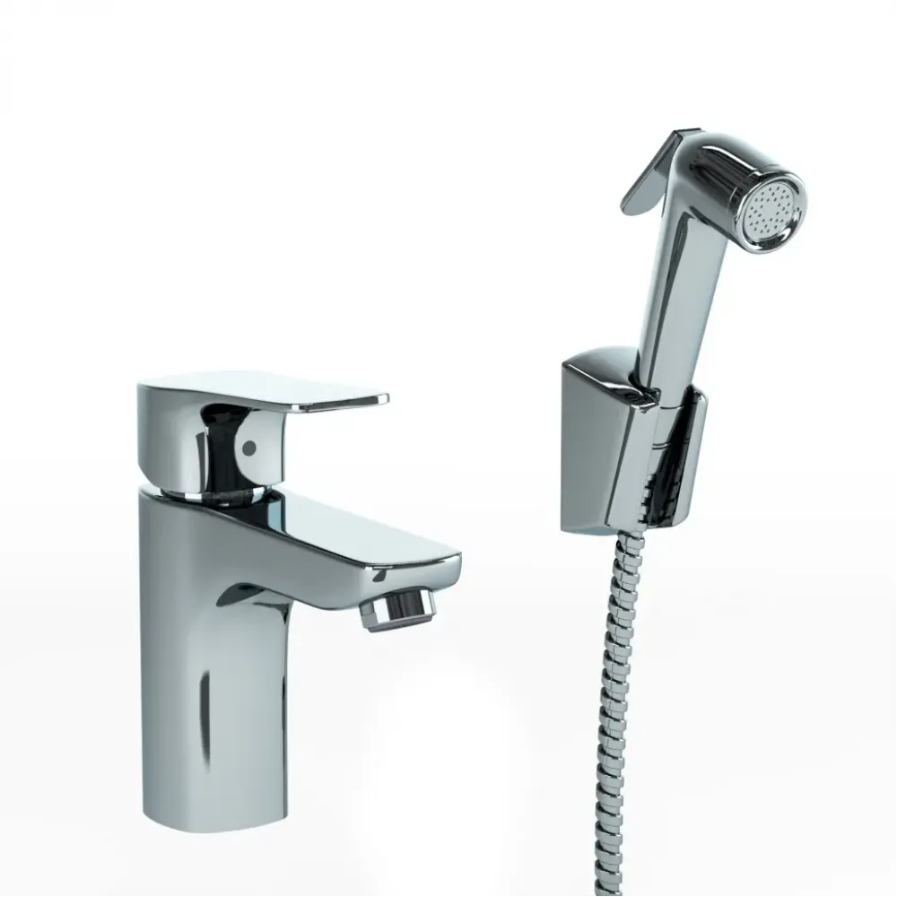 Это единое решение, позволяющее установить и смеситель, и гигиенический душ без сложного монтажа. Крепление смесителя выполняется напрямую к раковине, для лейки предусмотрен подвесной фиксатор.