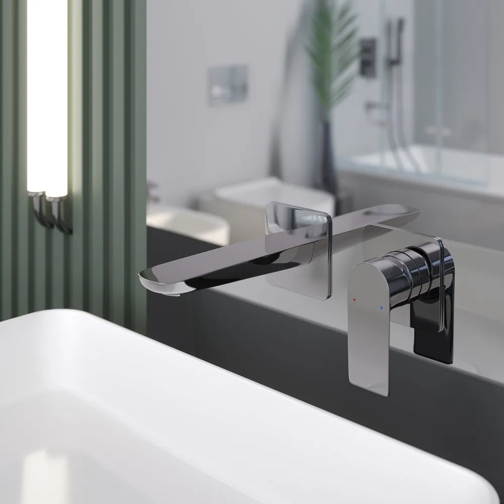 Раздельный смеситель из стены, с удобной поворотной ручкой для регулировки температуры выходящей воды. Выполнен в современном стиле, Имеет плоскую, квадратную форму, благодаря чему, максимально удобен в эксплуатации, и имеет удобную эргономику. Цвет - хром.