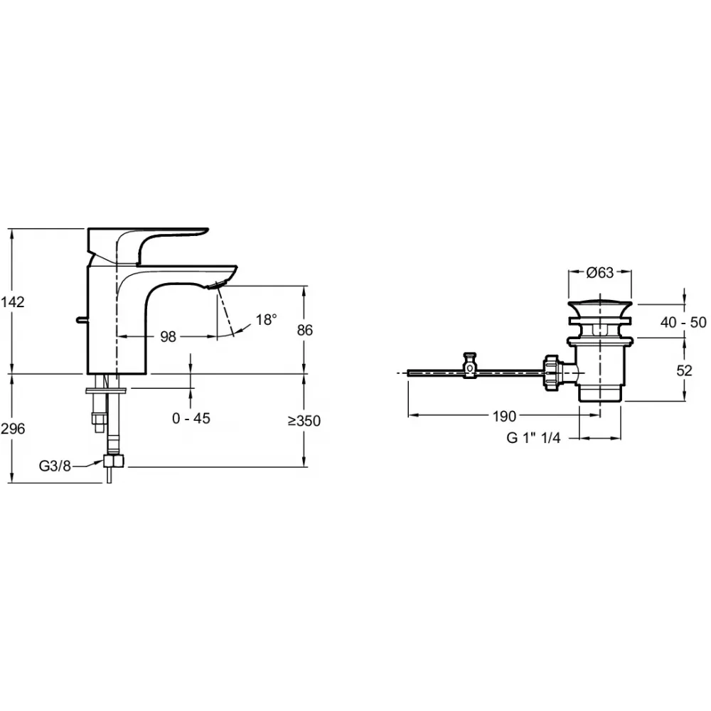 Технические характеристики Смеситель для умывальника Aleo 9 л/мин, неповоротный излив, с донным клапаном E98332-4-CP Jacob Delafon