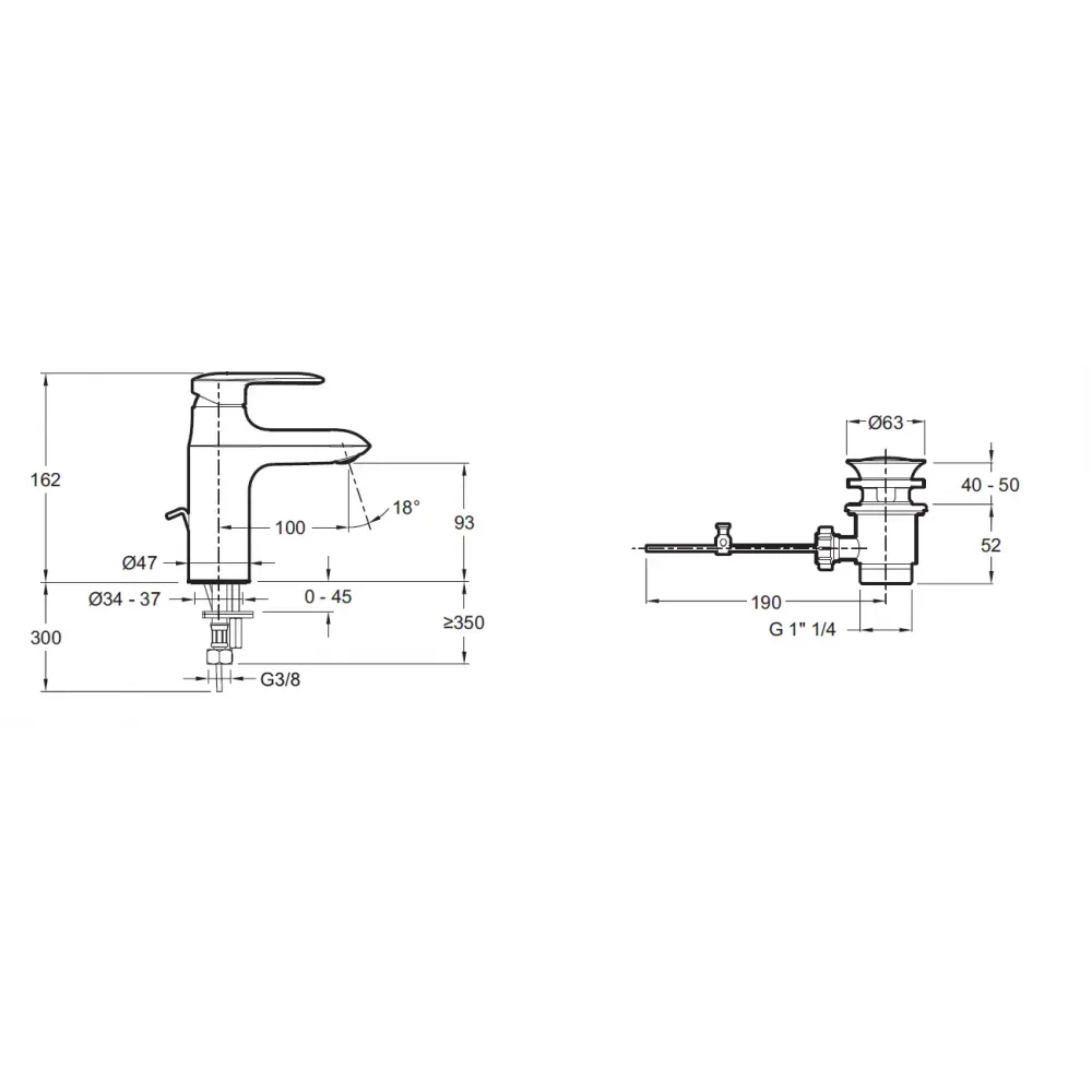 Рычаг донного клапана сбоку: простая установка на небольшие раковины, удобство использования
