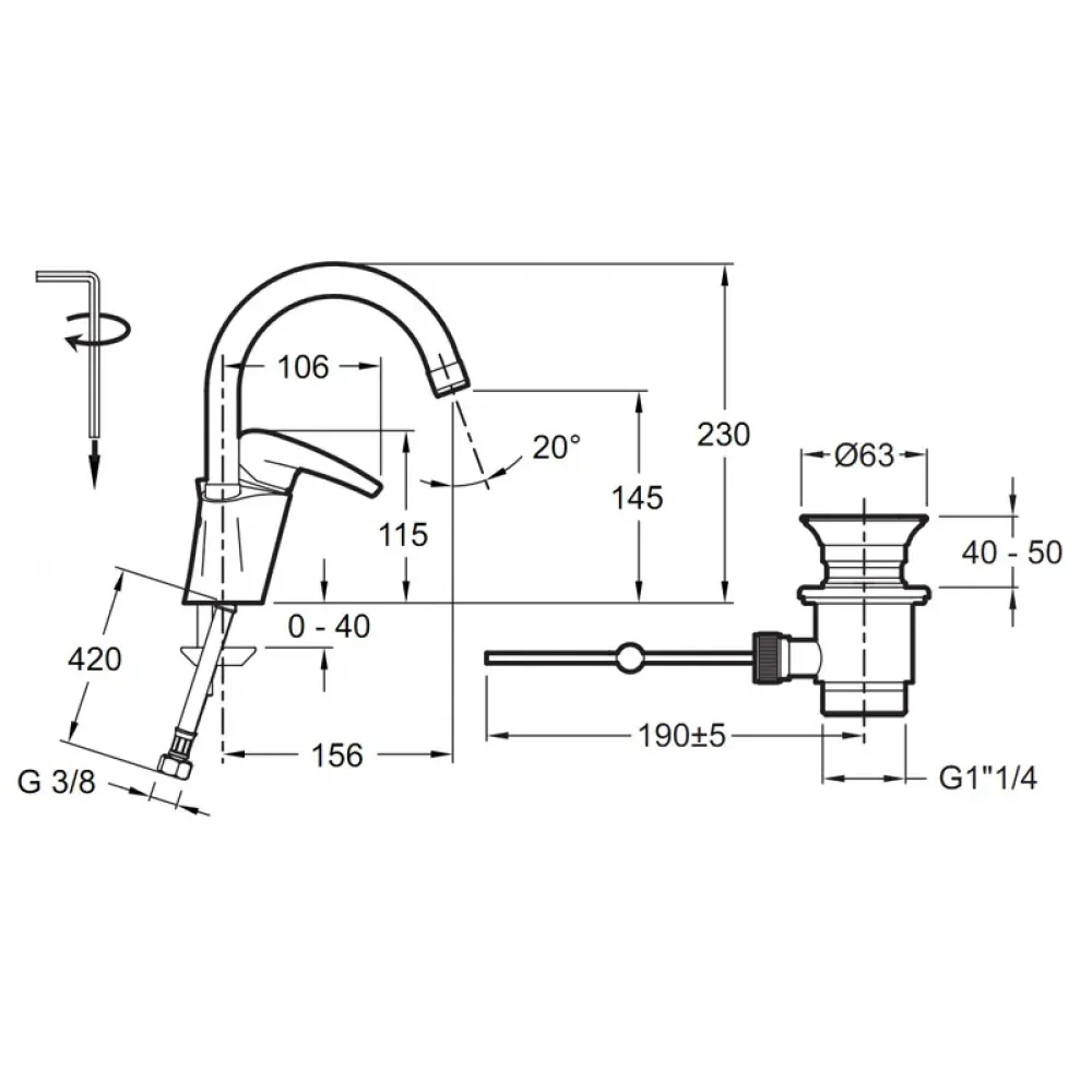 Технические характеристики Смеситель для умывальника Panache поворотный излив, без донного клапана E72241-CP Jacob Delafon