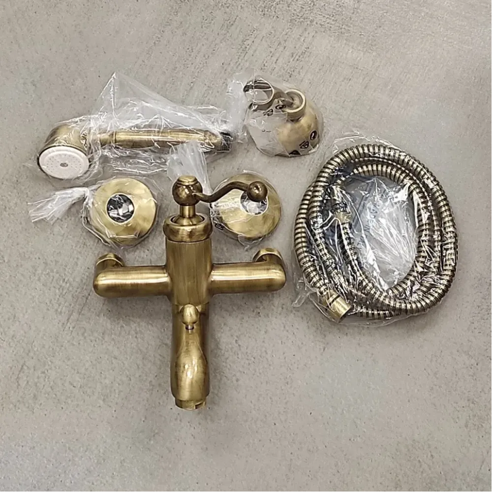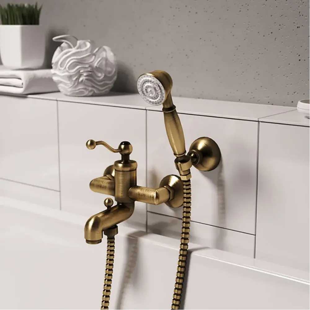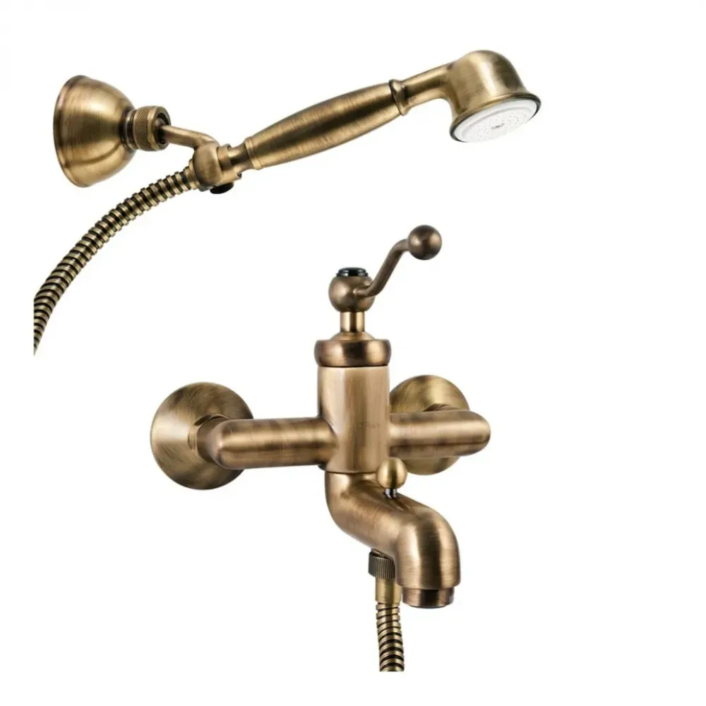 Смеситель для ванной с аксессуарами (лейкой, креплением и шлангом) в изысканном цвете старая бронза может быть дополнен смесителем для раковины (в том числе и высоким) в едином ретро стиле.