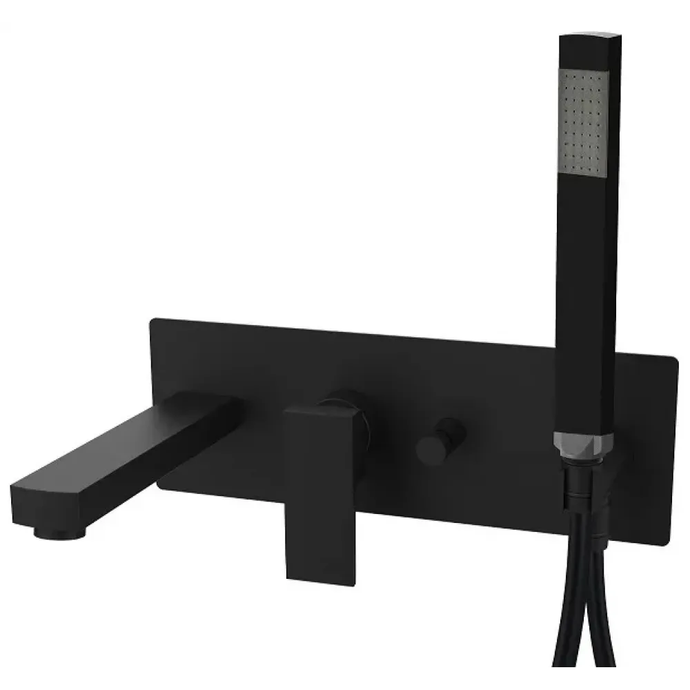 Смеситель для ванны с душем встраиваемый Paffoni Elle EL001NO с девиатором на 2 выхода, в комплекте с душевым гарнитуром и накладкой из нержавеющей стали 350х120мм, девиатор-кнопка, черный матовый