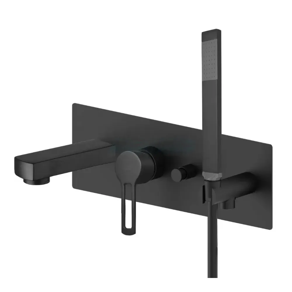 Смеситель для ванны с душем Paffoni Ringo RIN001NO встраиваемый с девиатором на 2 выхода, в комплекте с душевым гарнитуром и накладкой из нержавеющей стали 350х120мм, девиатор-кнопка, черный матовый