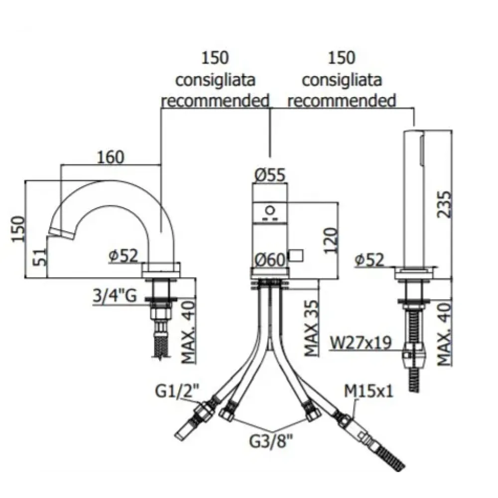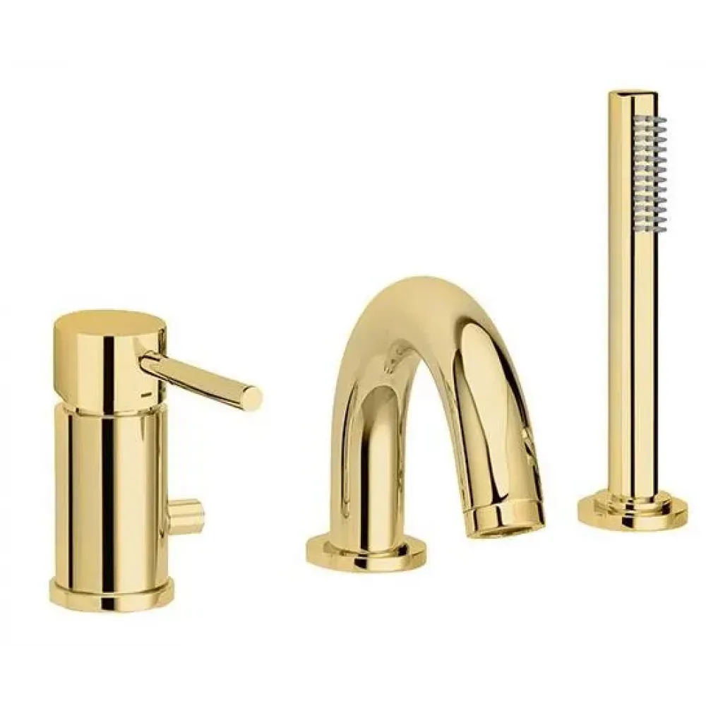 Смеситель на борт ванны с душем Paffoni Light LIG047HG на 3 отверстия с увеличенным расходом MAX FLOW, с душем MASTER, с комплеком подключений, золото медовое