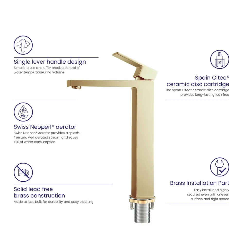 | Тип смесителяДля раковины-чаши, Для раковины | УправлениеОднорычажное | ЦветЗолото матовое |