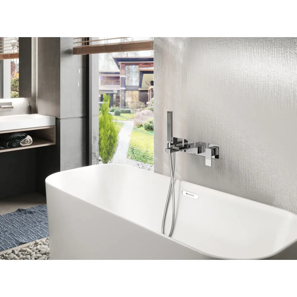 Встраиваемый смеситель Timo Selene 2014 предназначен для монтажа в твердой или полой стене. Уникальная дизайнерская модель с раздельными горизонтальными блоками, создаст неповторимый современный интерьер в ванной комнате. Основные преимущества встроенного смесителя: коммуникации, крепления и механизмы спрятаны в стену и видны только декоративные элементы, установить встроенный смеситель можно в любом месте. Стильная лейка-карандаш удобна в использовании и фиксируется в держателе с подключением шланга для душа. Регулировка температуры и напора воды осуществляется джойстиком справа. Переключение потока воды с излива на ручную лейку осуществляется поворотом ручки дивертора. Сложностей монтажа не возникает при установке смесителя опытным сантехником. Внимательно изучите инструкцию по монтажу и эксплуатации.