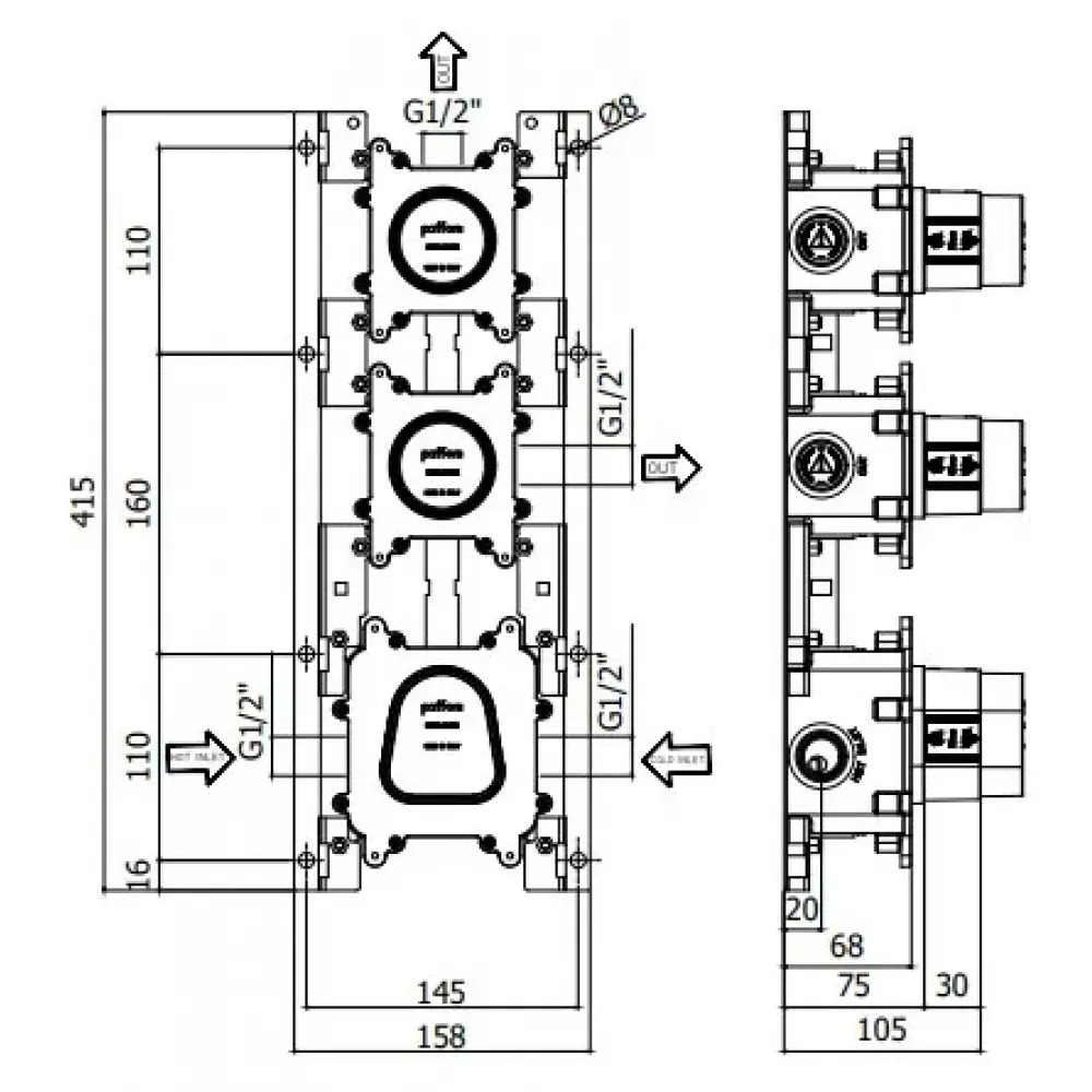 Скрытый механизм Paffoni Modular box MDBOX018 встраиваемая часть, термостат для смесителей Paffoni арт. MDE018.., 2 выхода, расположение горизонтальное или вертикальное. В горизонтальном положении термостат справа