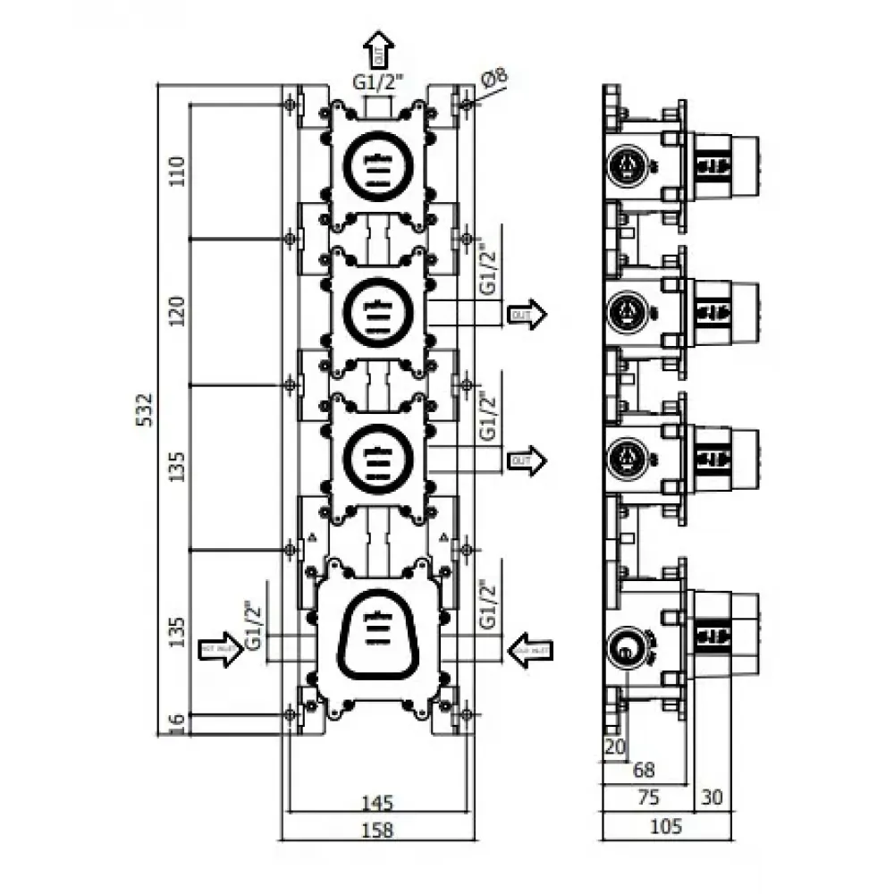 Скрытый механизм Paffoni Modular box MDBOX019 встраиваемая часть, термостат для смесителей Paffoni арт MDE019.., 3 выхода, расположение горизонтальное или вертикальное. В горизонтальном положении термостат справа