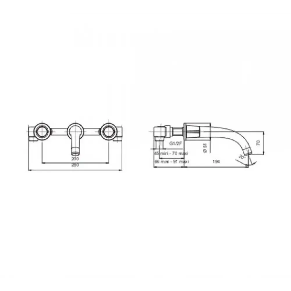 Настенный смеситель на три отверстия с неподвижным изливом, гибкой подводкой, без донного клапана.