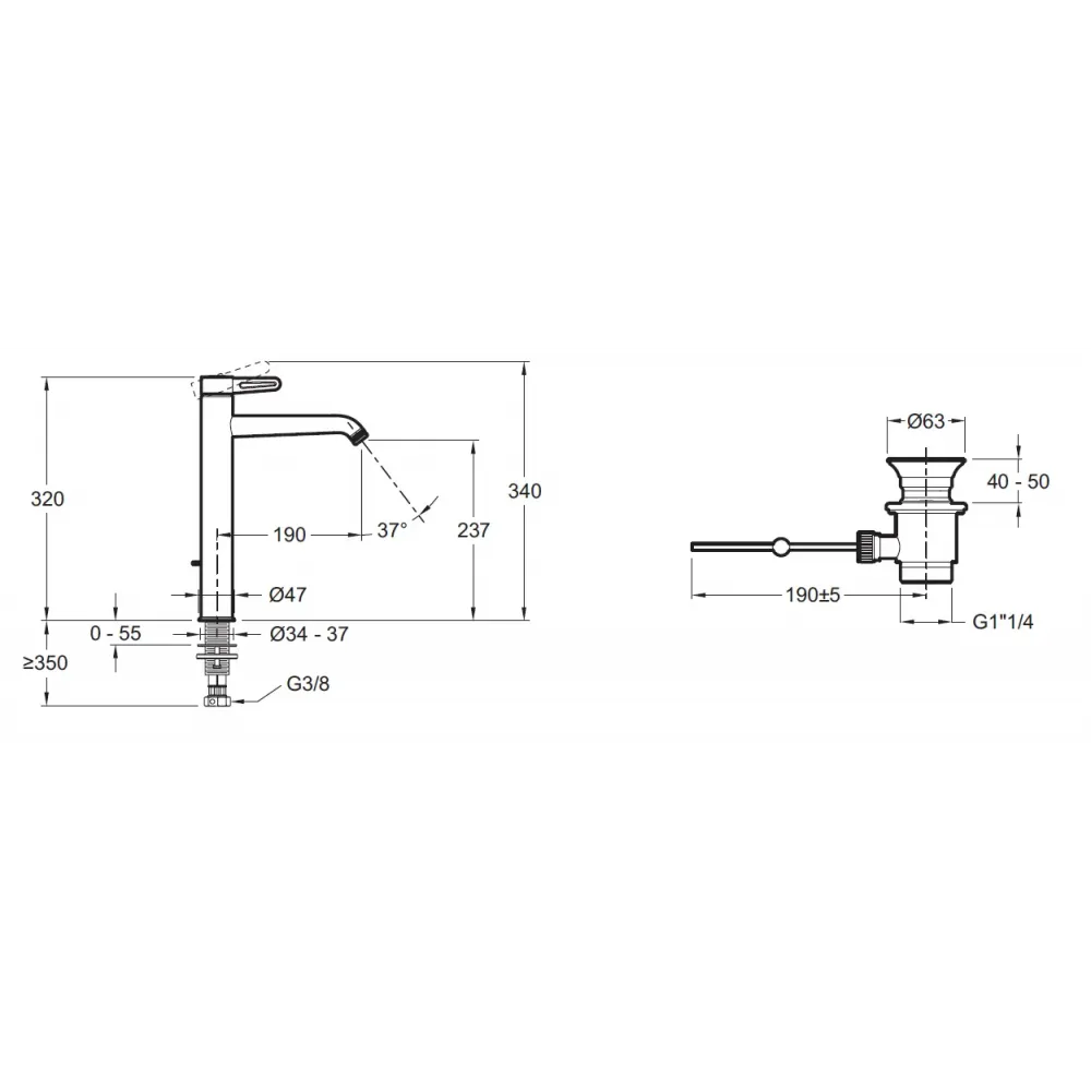 Технические характеристики Высокий смеситель на столешницу Nouvelle Vague 32 см, матовый хром, неповоротный излив, с донным клапаном E78337-CAT Jacob Delafon
