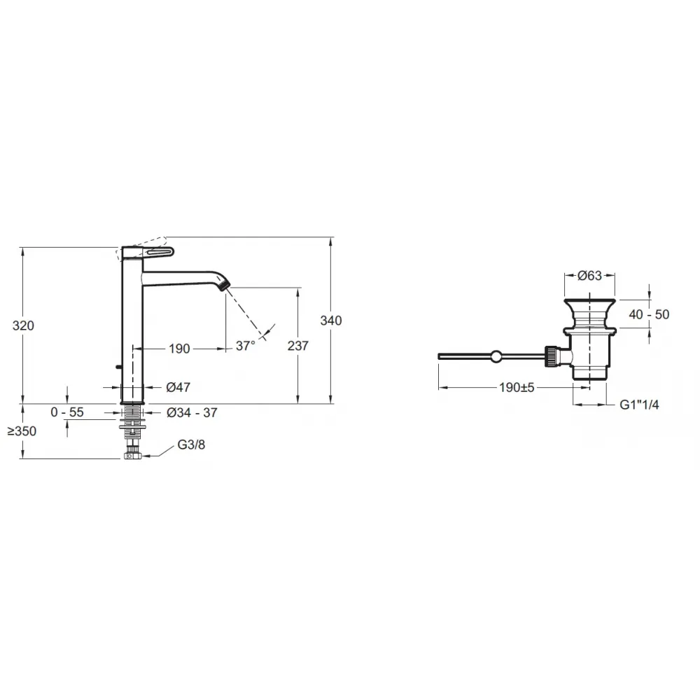 Технические характеристики Высокий смеситель на столешницу Nouvelle Vague 32 см, матовый, неповоротный излив, чёрный цвет, с донным клапаном E78337-BLV Jacob Delafon