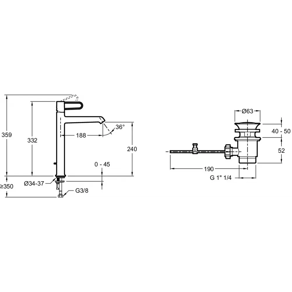 Технические характеристики Высокий смеситель на столешницу Odeon Rive Gauche 33,2 см, ручка хром, чёрный цвет, неповоротный излив, с донным клапаном E21030-CP-BL Jacob Delafon