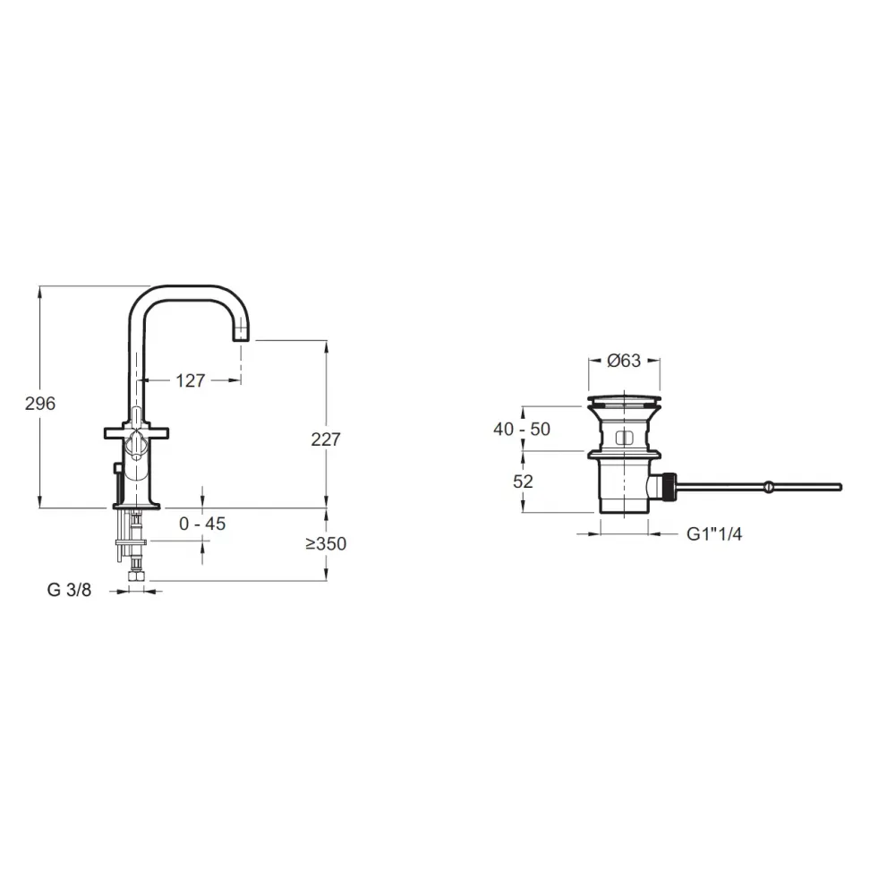 Технические характеристики Высокий смеситель на столешницу Purist 29,6 см, поворотный излив, с донным клапаном E14595-3-CP Jacob Delafon