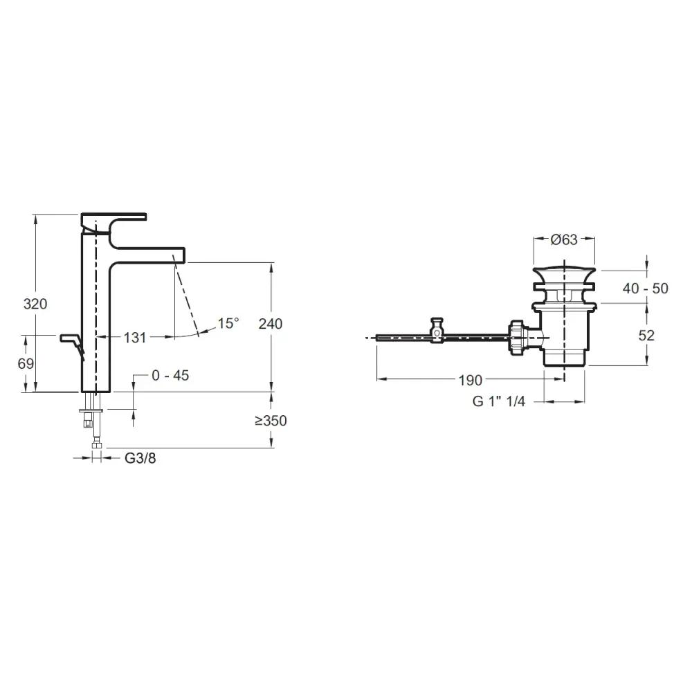 Технические характеристики Высокий смеситель на столешницу Strayt 24 см, неповоротный излив, с донным клапаном E37329-CP Jacob Delafon