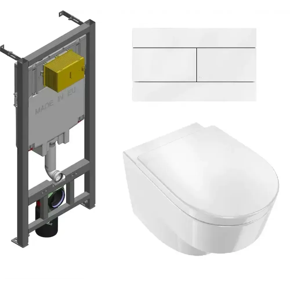 Комплект унитаза с инсталляцией Odeon Rive Gauche глубина унитаза 54см, клавиша белая, с микролифтом, безободковый OdeonE29025-NF+E4316-CP Jacob Delafon