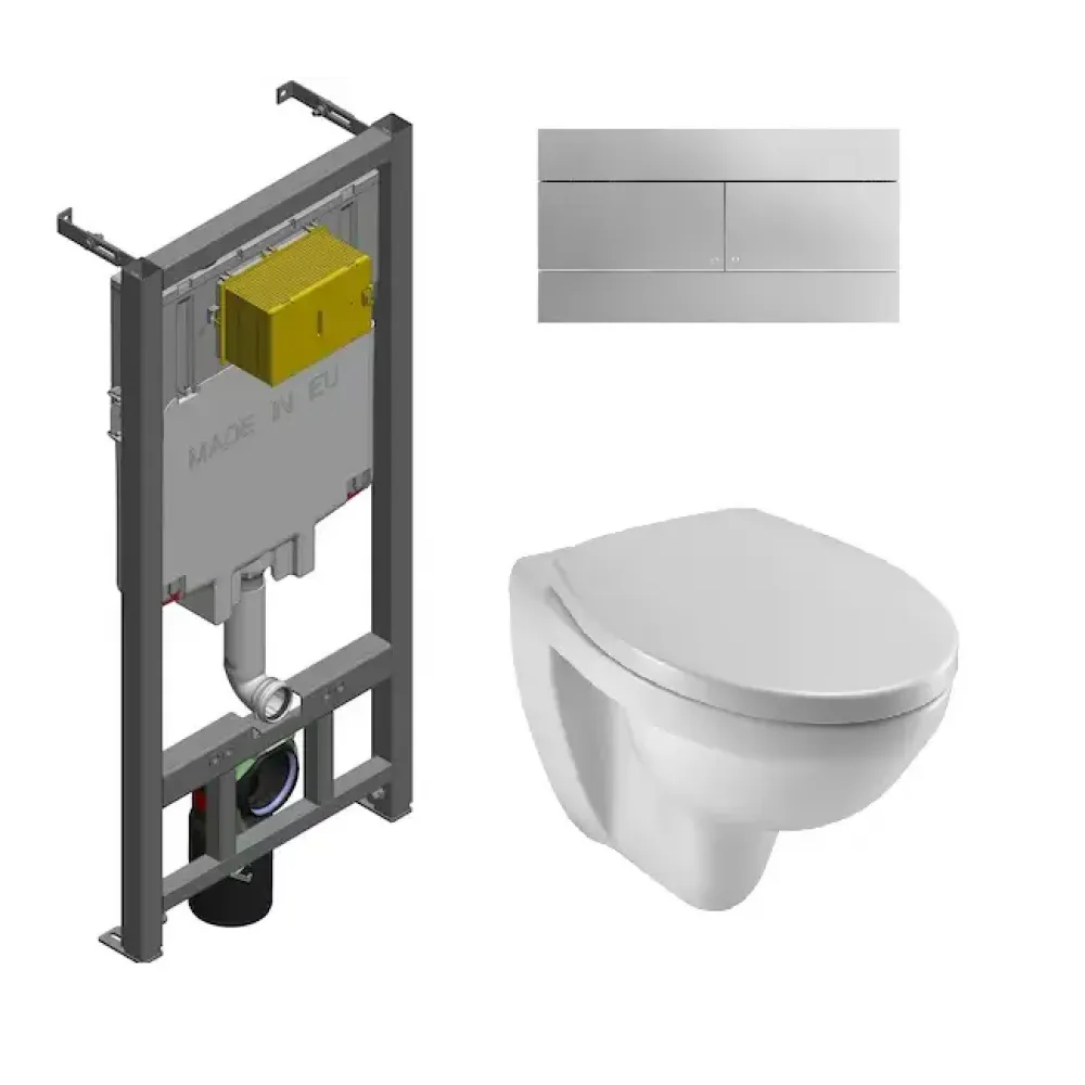 Patio, комплект унитаза с инсталляцией, глубина унитаза 54см, клавиша хром глянец, с микролифтом, безободковый, арт. E21739RU-00, Jacob Delafon