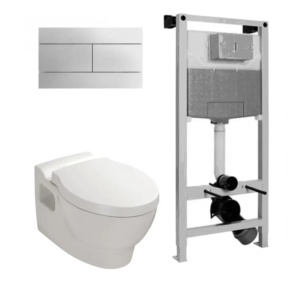 Настенная опорная рама с бачком со встроенным механизмом экономии воды 3/6 л (Производство Португалия). В сборе (требуется несущая стена, крепления к полу и стене) для подвесных унитазов. Диаметр слива 90-110 мм.