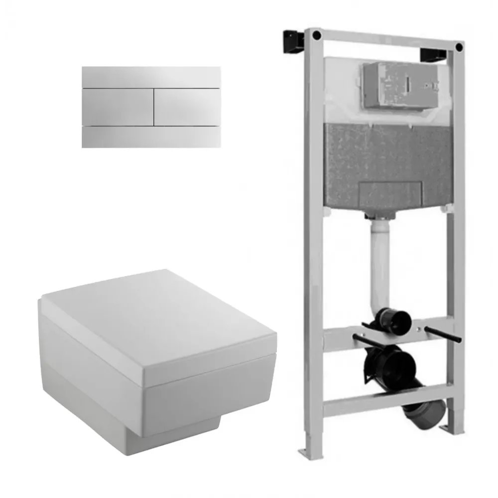 Настенная опорная рама с бачком со встроенным механизмом экономии воды 3/6 л (производство Португалия). В сборе (требуется несущая стена, крепления к полу и стене) для подвесных унитазов. Диаметр слива 90-110 мм.